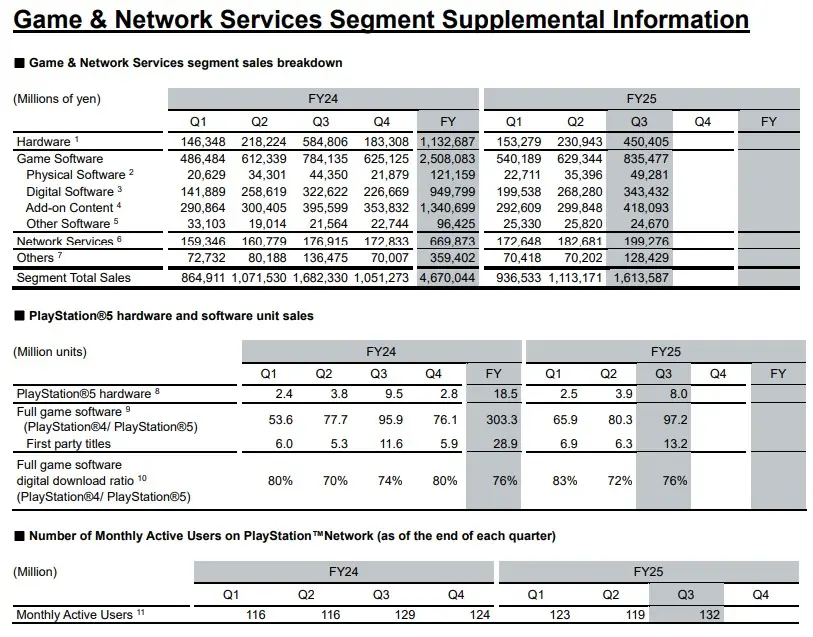 سونی همچنین آمار تازهای از وضعیت شبکه پلیاستیشن منتشر کرده است. بر اساس این دادهها، تعداد کاربران فعال ماهانه پلیاستیشن نتورک تا ۳۱ دسامبر ۲۰۲۵ به ۱۳۲ میلیون نفر رسیده که نسبت به سال مالی قبل، افزایش ۳ میلیون کاربر را نشان میدهد. این رشد نشاندهنده گسترش تعامل کاربران با خدمات آنلاین سونی است و نقش کلیدی سرویسها در اکوسیستم پلیاستیشن را برجسته میکند.
