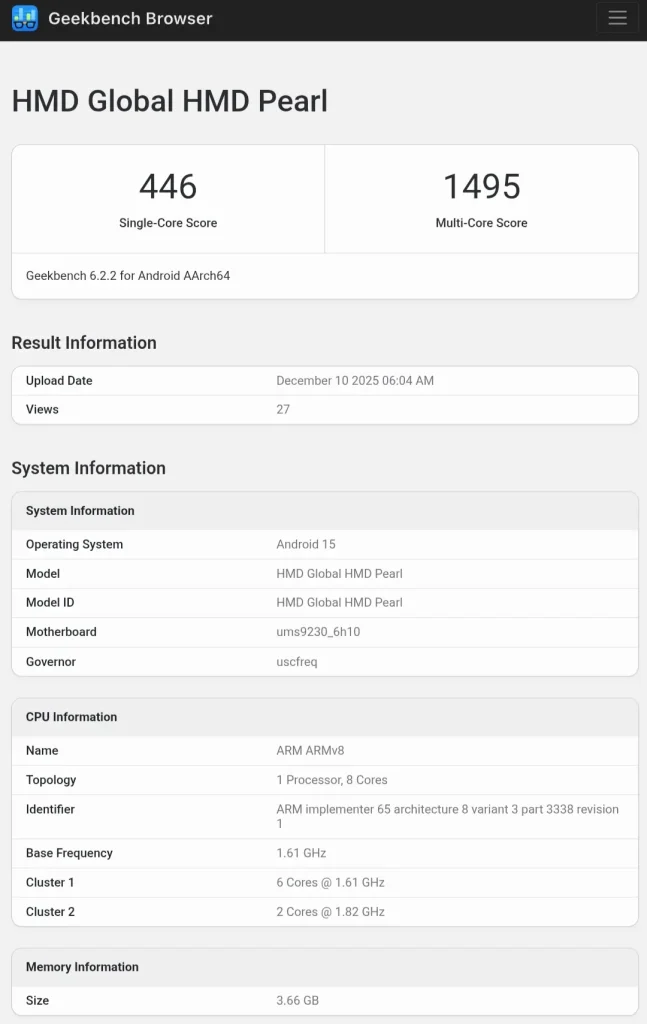 یک گوشی جدید از برند HMD در پایگاه داده گیکبنچ دیده شده که بهاحتمال زیاد همان HMD Pulse 2 Pro است. این دستگاه با نام رمز Pearl ثبت شده و اطلاعات مهمی از جمله چیپست، میزان رم و نسخه سیستمعامل آن را فاش میکند. انتشار این بنچمارک، اولین نگاه جدی به مشخصات فنی این گوشی اقتصادی پیش از معرفی رسمی محسوب میشود.