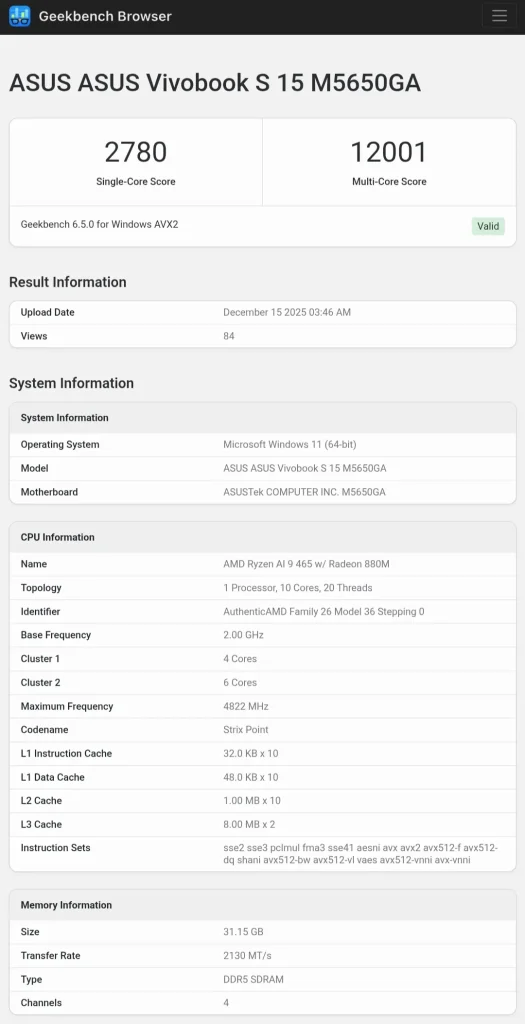 نتایج گیک‌بنچ نشان می‌دهد Ryzen AI 9 465 امتیاز حدود ۲۷۸۰ را در تست تک‌هسته‌ای و ۱۲۰۰۱ را در تست چندهسته‌ای ثبت کرده است. این اعداد بسیار نزدیک به میانگین امتیازات Ryzen AI 9 365 هستند. با در نظر گرفتن نوسان طبیعی بنچمارک‌ها، می‌توان گفت عملکرد کلی این پردازنده تفاوت محسوسی با نسل قبلی ندارد.
