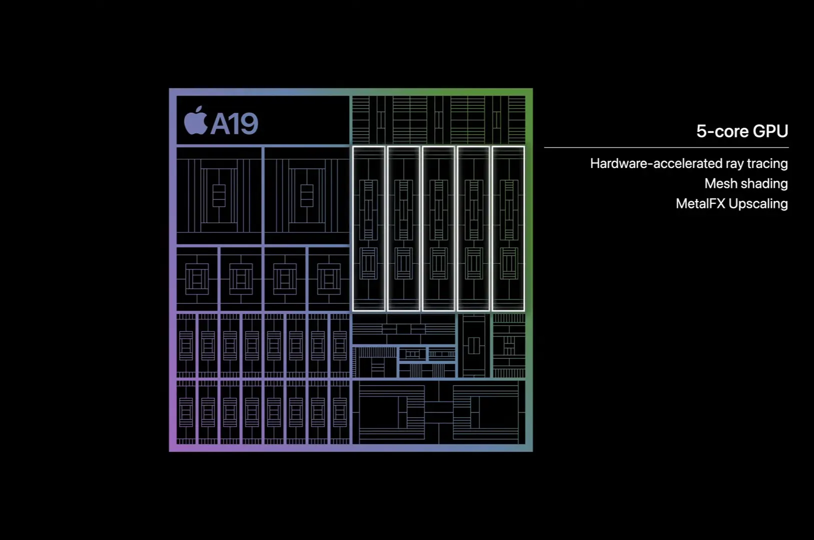 نسخهی معمولی A19 که در آیفون ۱۷ استفاده شده، دارای پردازنده گرافیکی ۵ هستهای است، در حالی که A19 Pro نسخهی شش هستهای دارد. اما نکته جالب اینجاست که A19 Pro موجود در آیفون ایر فقط دارای ۵ هسته GPU است. ظاهراً A19 Pro از معماری GPU «نسل دوم» استفاده میکند تا تمامی قابلیتهای Pro موجود در آیفون ۱۷ پرو و آیفون ۱۷ پرو مکس را پشتیبانی کند. هر دو GPU از Ray Tracing سختافزاری و MetalFX Upscaling پشتیبانی میکنند. همچنین، هر دو تراشه دارای چیپ شبکه بیسیم جدید N1 اپل هستند که از وایفای ۷ و بلوتوث پشتیبانی میکند.