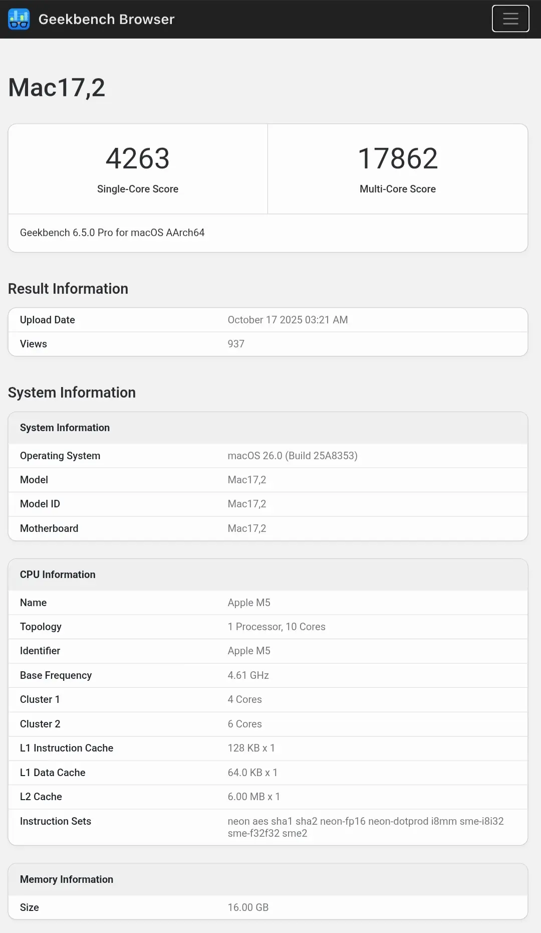 براساس اطلاعات ثبتشده، مکبوک پرو مجهز به تراشهی M5 و ۱۶ گیگابایت رم در تست تکهستهای گیکبنچ امتیاز ۴,۲۶۳ را بهدست آورده است؛ عددی که نشاندهندهی افزایش ۱۳ درصدی عملکرد نسبت به تراشهی M4 با میانگین امتیاز ۳,۷۴۸ است. در بخش چندهستهای نیز امتیاز ۱۷,۸۶۲ ثبت شده که ۱۷ درصد سریعتر از نسل گذشته محسوب میشود. این پیشرفت عمدتاً به دلیل افزایش تعداد هستههای پردازشی در M5 است.