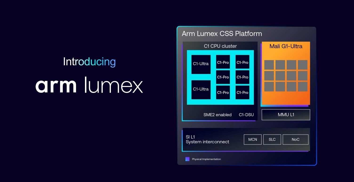 شرکت Arm از چهار هستهی جدید پردازنده مرکزی رونمایی کرده است؛ Lumex C1 Ultra، Lumex C1 Pro، Lumex C1 Premium و Lumex C1 Nano، همراه با پردازندهی گرافیکی جدید Mali G1-Ultra. انتظار میرود این هستهها در هفتههای آینده همراه با MediaTek Dimensity 9500 معرفی شوند.