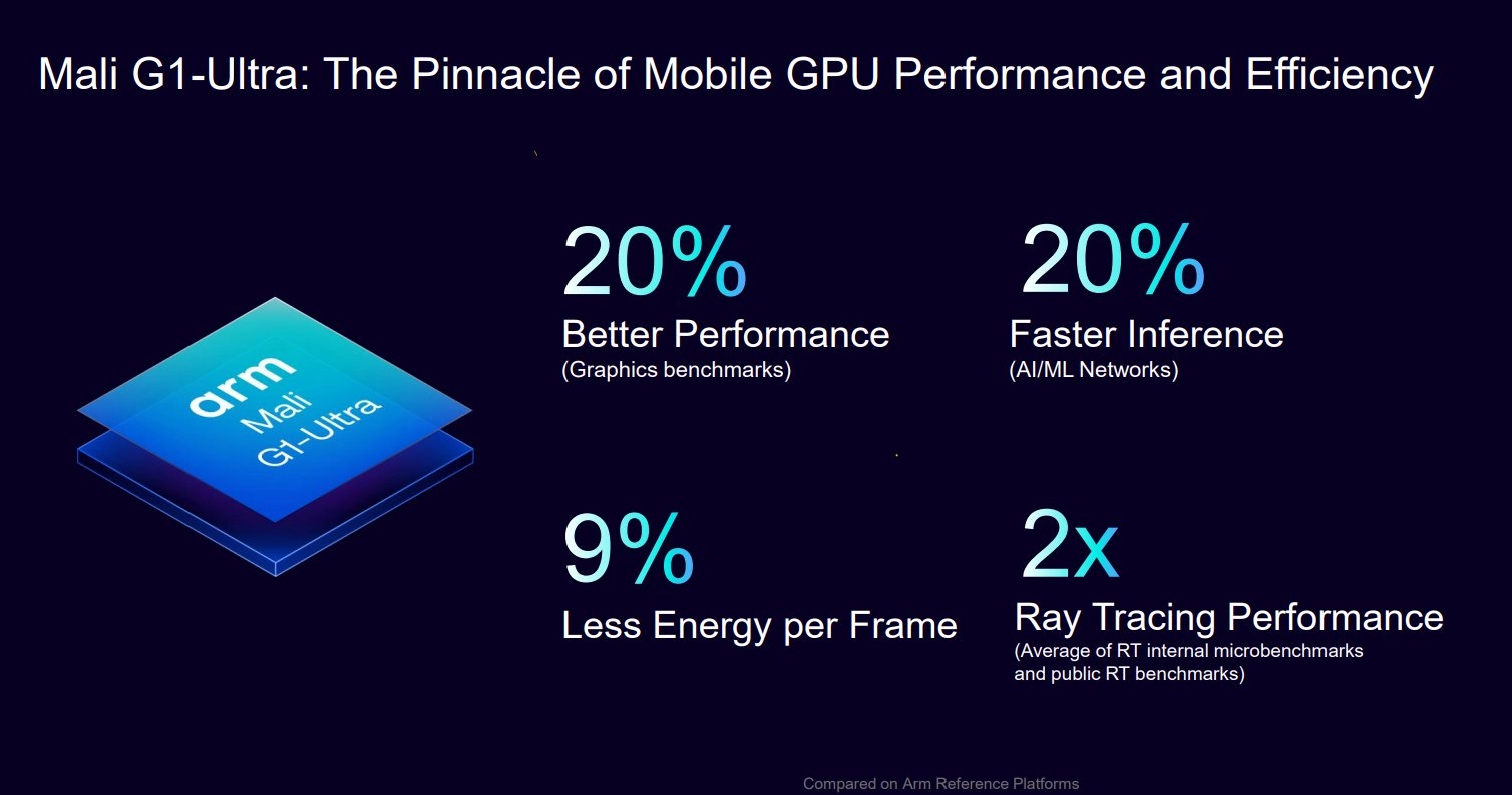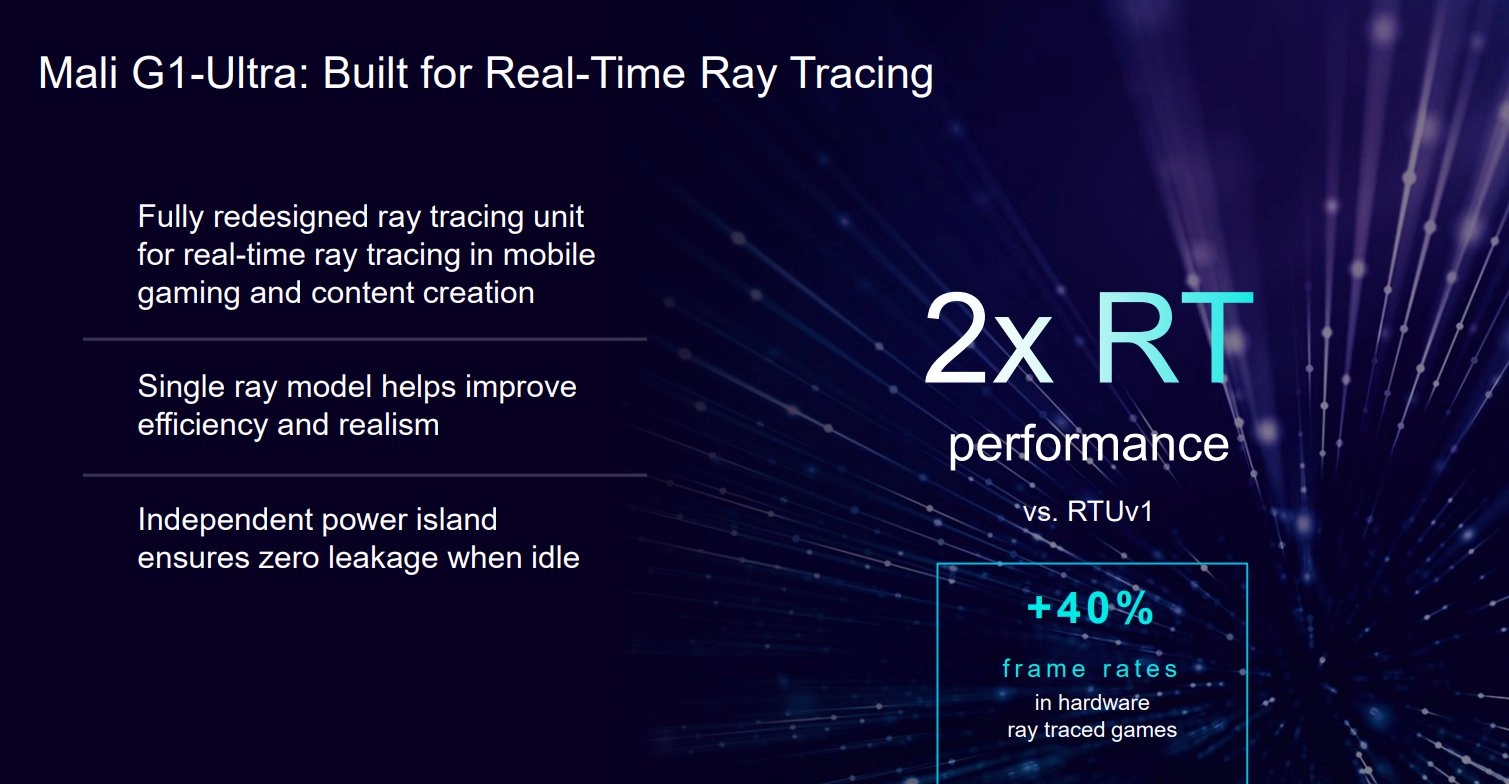 برند Immortalis برای GPUهای Arm با Ultra جایگزین شده و هنوز مشخص نیست که SKUهای پایینتر چه نامی خواهند داشت. پیشتر یک لیست Geekbench مربوط به Dimensity 9500 نیز نام جدید را نشان داده بود. Arm ادعا میکند Mali G1-Ultra در عملکرد خام تا ۲۰٪ بهتر شده و توانایی ردیابی پرتو (Ray Tracing) آن دو برابر افزایش یافته است، که در مجموع میتواند FPS را تا ۴۰٪ افزایش دهد.