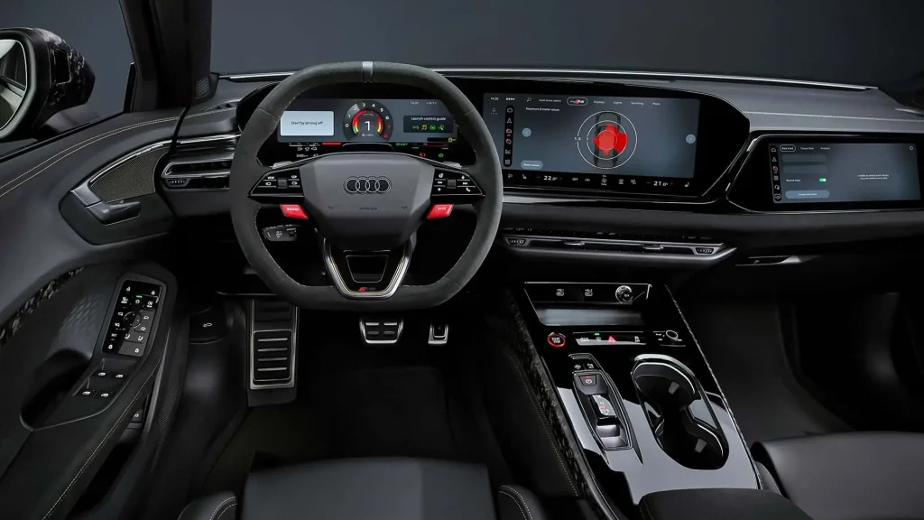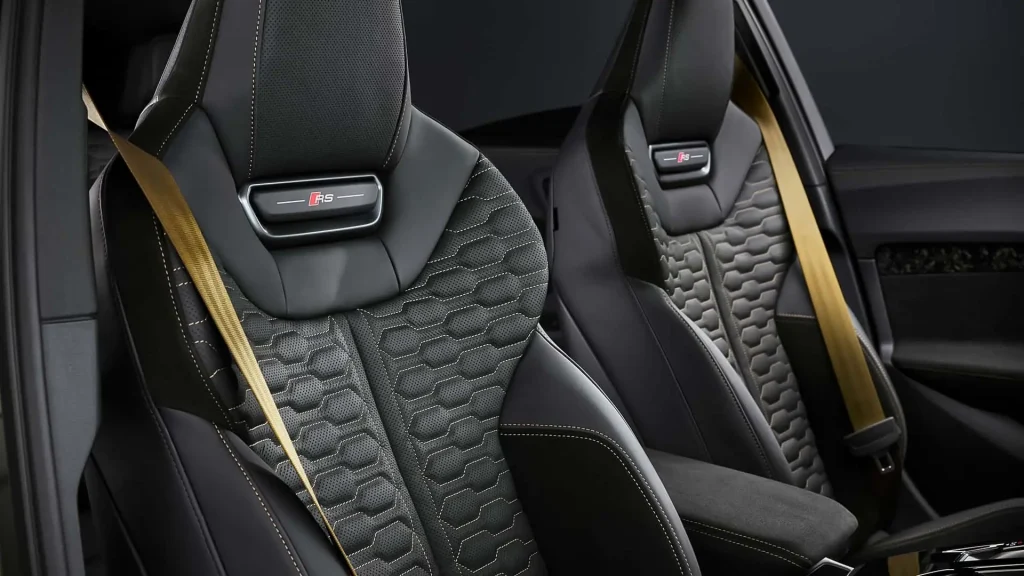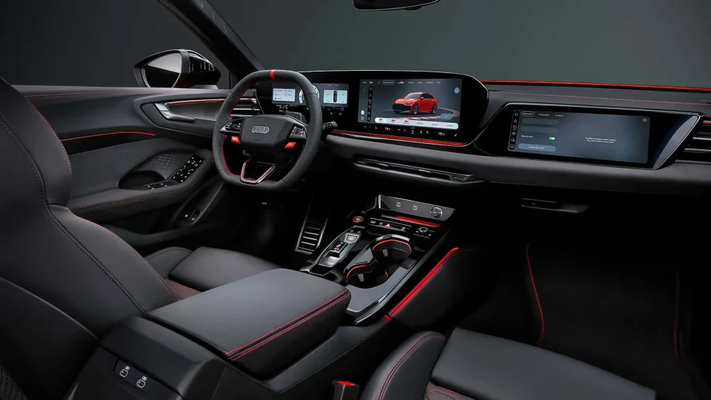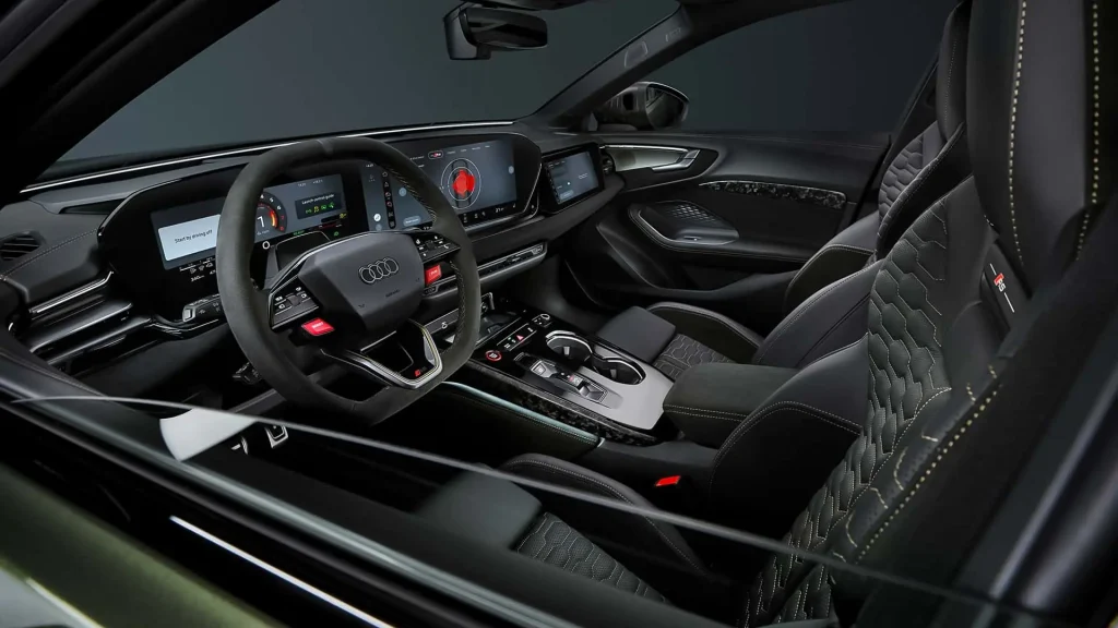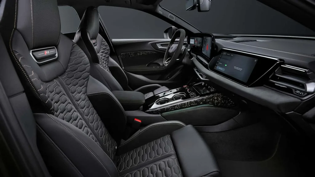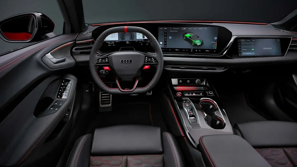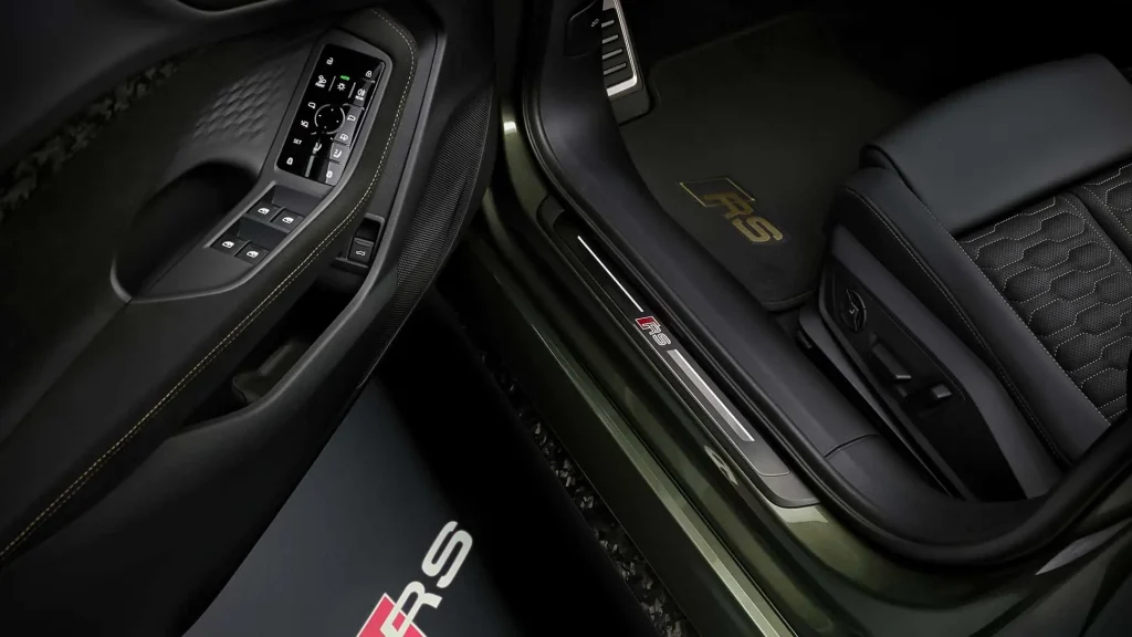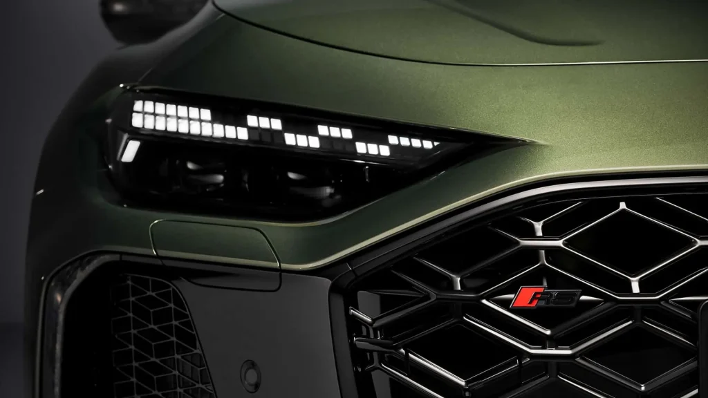 چراغهای ماتریکس LED با رنگ تیره و حلقههای چهارگانه سیاه، جلوه دراماتیک خودرو را تقویت کرده و طرح پرچم شطرنجی در چراغهای OLED عقب نیز هویت بصری خاص RS را نشان میدهد. برای علاقهمندان، برخی عناصر خارجی از جمله اسپویلر و جلوپنجره از فیبرکربن قابل سفارش است تا ظاهری اسپرتتر و متمایز به خودرو بدهد.