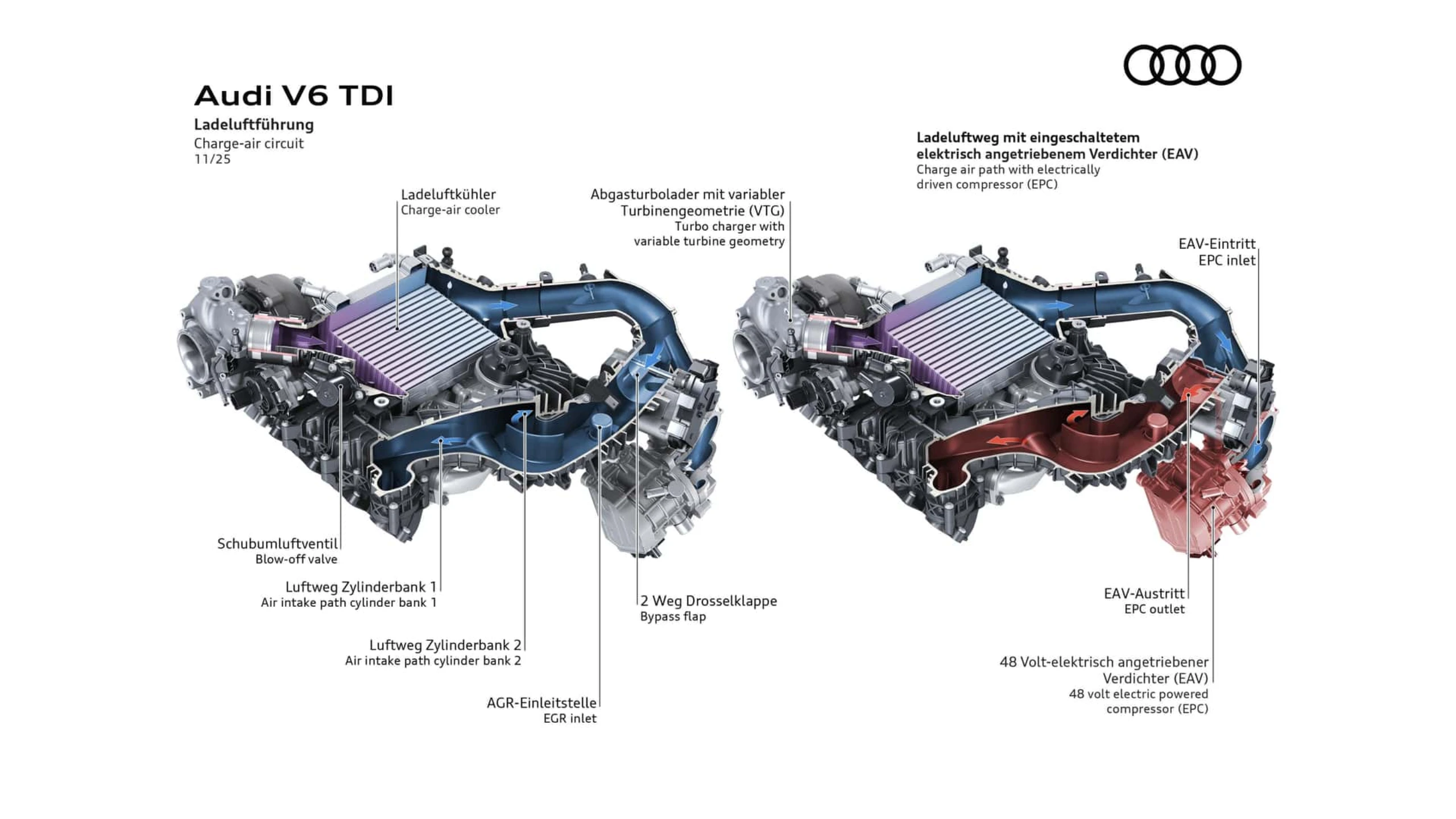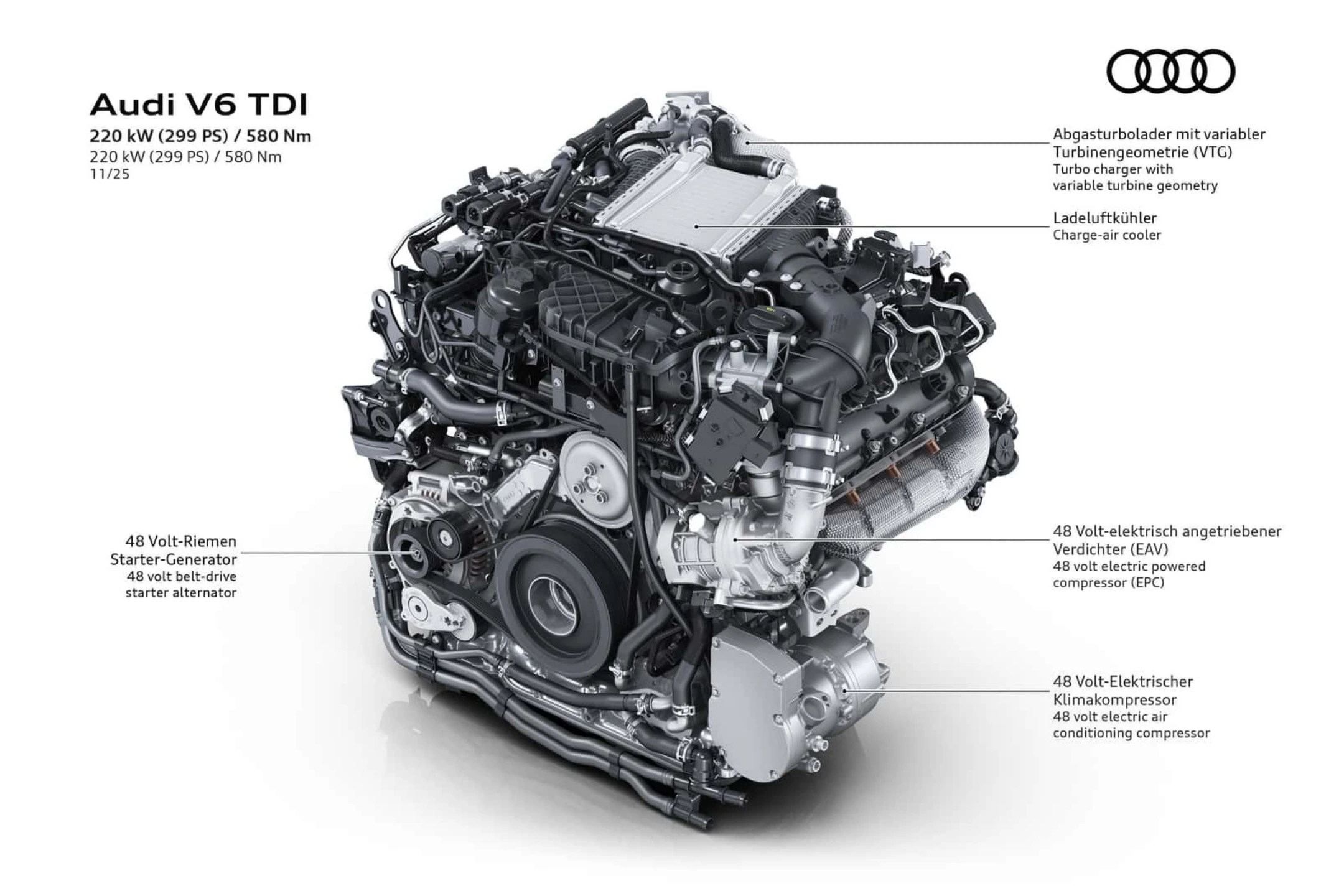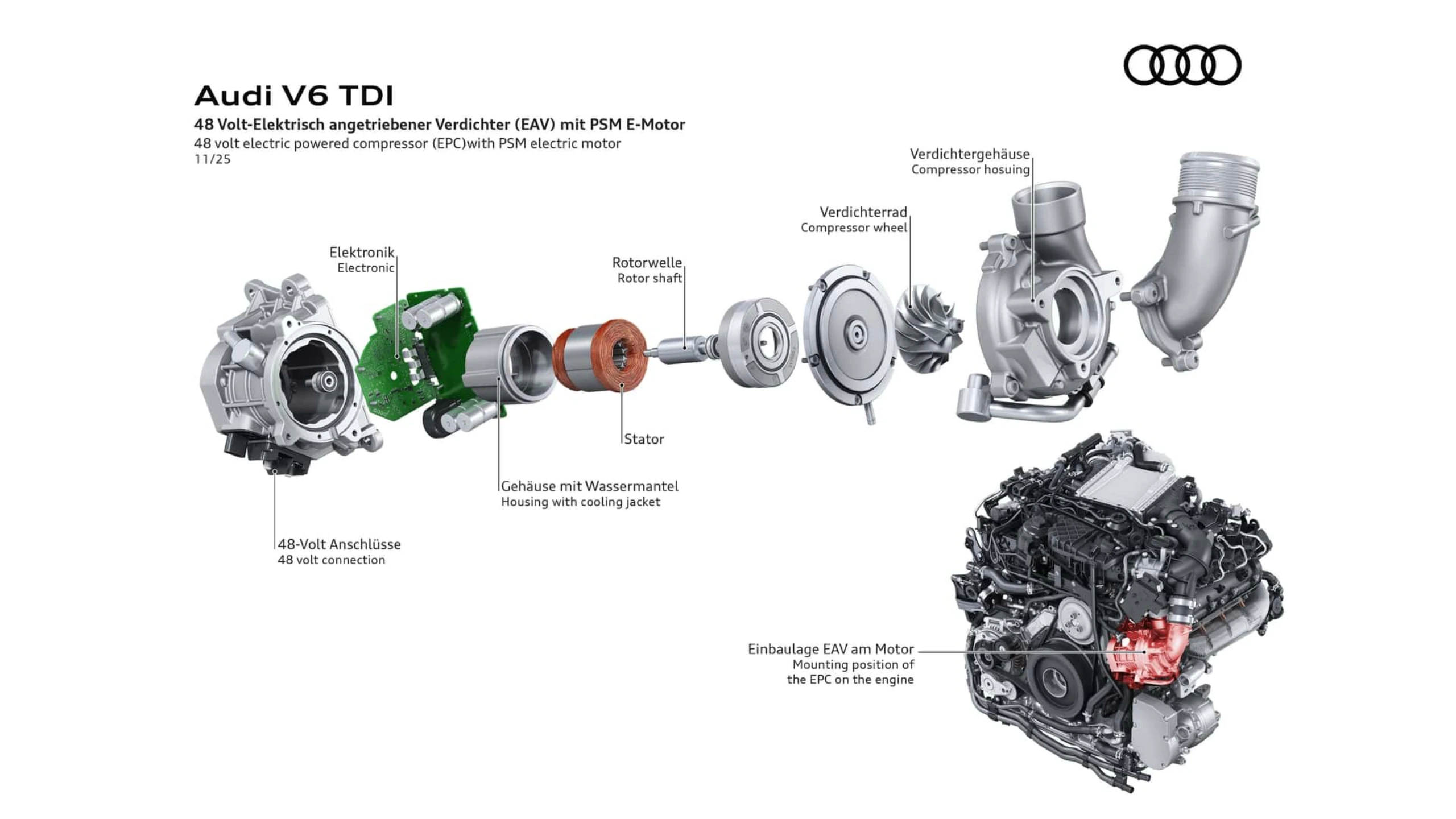 این موتور جدید که در مدلهای A6 و Q5 عرضه میشود، ترکیبی از سیستم هیبریدی ملایم و یک کمپرسور برقی است. اگرچه آئودی پیشتر نیز موتورهای ۴۸ ولتی V6 دیزلی ارائه داده بود، اما این نخستین بار است که سختافزار MHEV با یک کمپرسور برقی کار میکند. این کمپرسور پس از توربوشارژر و اینترکولر در مسیر ورودی قرار گرفته.