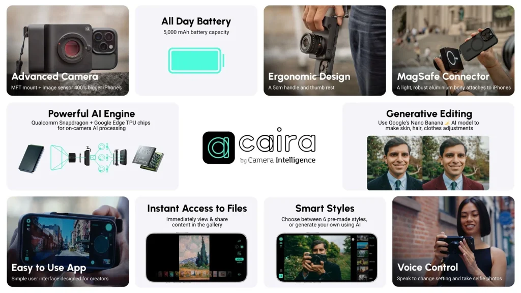 کایرا بهعنوان یک ارتقای کامل برای دوربین آیفون معرفی شده و از طریق اتصال مغناطیسی MagSafe به گوشی متصل میشود. حسگر FourThirds آن بنا به گفتهی سازنده، تا ۴۰۰ درصد بزرگتر از حسگر اصلی آیفون ۱۷ پرو است. افزون بر این، اتصال micro-FourThirds به کاربران اجازه میدهد صدها لنز از برندهایی مانند Olympus و Panasonic را بهکار ببرند؛ قابلیتی که آزادی عمل زیادی به عکاسان میدهد.در بدنهی این دوربین تنها یک دکمه برای شاتر وجود دارد و کنترل کامل آن از طریق اپلیکیشن مخصوص در آیفون انجام میشود.