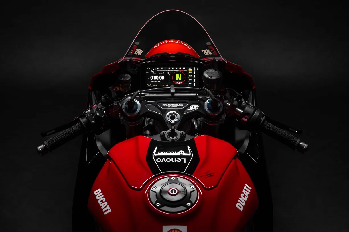 امکانات اختصاصی شامل کلاچ خشک، جاپایی آلومینیومی Billet قابل تنظیم و ماژول GPS است. برای پیست نیز درپوش مخزن سوخت مسابقهای، شیلد کالیپر، کاور کلاچ کربنی باز و کیت حذف نگهدارنده پلاک استاندارد ارائه میشود. تعلیق مشابه V4 S بوده و شامل فورکهای Öhlins NPX 30 و کمکفنر عقب Öhlins TTX 36 است. مخزن سوخت نیز با امضای مارکز، قهرمان MotoGP 2025 و دارنده نهمین عنوان جهانیاش تزئین شده است.