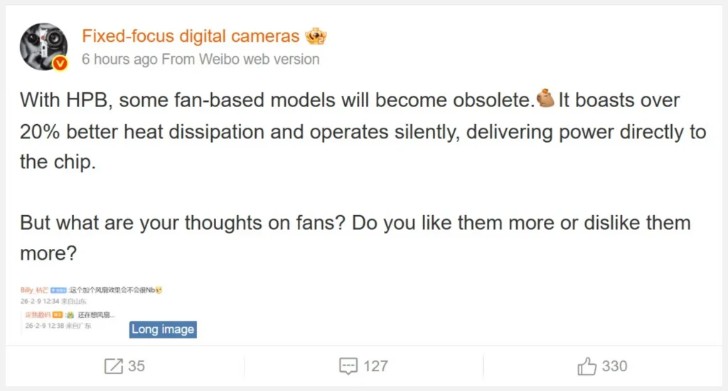 کاربران مدتهاست با صدای مزاحم فنهای سفارشی مشکل داشتهاند. بر اساس اطلاعات منتشرشده توسط یک منبع در Weibo، فناوری Heat Pass Block میتواند بازدهی دفع حرارت را تا ۲۰ درصد افزایش دهد. همچنین گزارشهای قبلی این منبع نشان میدهد که این سیستم به تراشهها اجازه میدهد تا فرکانسهای بالای ۵.۰۰ گیگاهرتز را در نسل بعدی تراشهها تجربه کنند.
