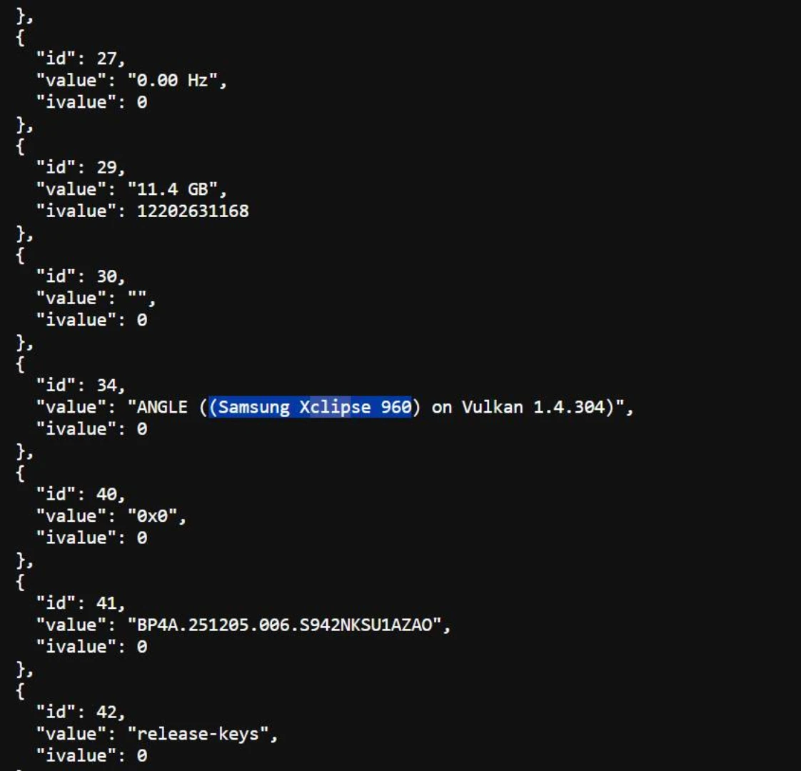 در نتایج گیک‌بنچ همچنین نام پردازنده گرافیکی Xclipse 960 دیده می‌شود، هرچند این بخش مستقیماً مورد آزمون قرار نگرفته است. سامسونگ اعلام کرده این GPU نسبت به نسل قبل، دو برابر توان محاسباتی و حدود ۵۰ درصد بهبود در رهگیری پرتو دارد. با این حال جزئیات دقیقی از معماری آن ارائه نشده و اطلاعات فعلی بیشتر بر پایه گزارش‌های غیررسمی استوار است.