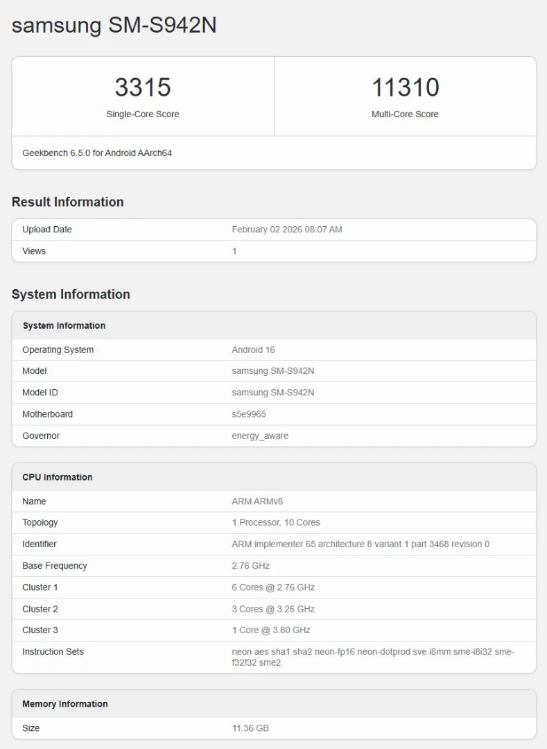 نسخه کره‌ای گلکسی S26 با شماره مدل SM-S942N به‌تازگی در پایگاه داده گیک‌بنچ رؤیت شده و همان‌طور که شایعات پیشین اشاره داشتند، به تراشه اگزینوس ۲۶۰۰ مجهز است. این در حالی است که مدل‌های مخصوص بازار آمریکا، یعنی SM-S942U و SM-S948U، پیش‌تر با اسنپدراگون 8 الیت نسل ۵ در همین بنچمارک دیده شده بودند. نمونه کره‌ای با ۱۲ گیگابایت رم و اندروید ۱۶ آزمایش شده.