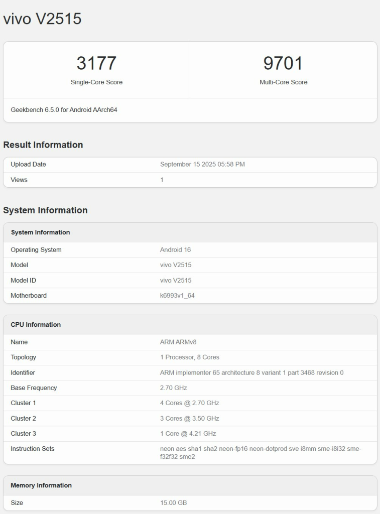 ویوو قرار است در تاریخ ۱۳ اکتبر سری Vivo X300 را در چین معرفی کند، اما به نظر میرسد عرضه جهانی هم نزدیک باشد؛ چراکه نسخه جهانی این گوشی اخیراً در پایگاه داده Geekbench دیده شده است. گزارشها نشان میدهند که نسخههای جهانی ویوو X300 و X300 Pro بهترتیب با شماره مدلهای V2515 و V2514 شناخته میشوند. همانطور که دیده میشود، مدل V2515 در Geekbench ظاهر شده و بخشی از مشخصات کلیدی آن را آشکار کرده است.