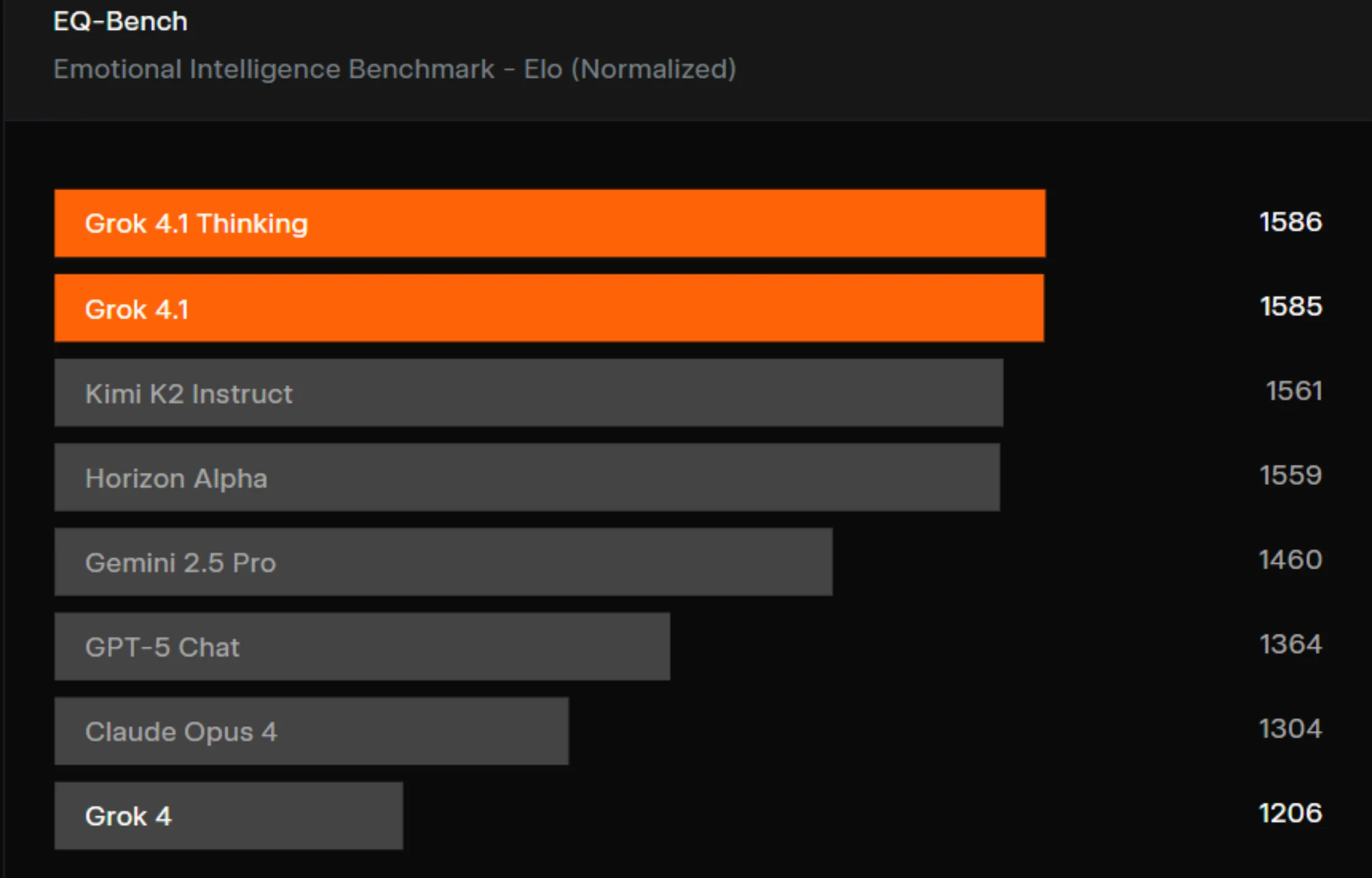 تنها چند ساعت پس از انتشار، Grok 4.1 به صدر دو لیدربورد مهم هوش مصنوعی صعود کرد. در LMArena’s Text Leaderboard، با امتیاز اولیه ۱۴۸۳ بالاتر از تمام مدلهای قابل گفتگو قرار گرفت. همچنین در EQ Bench 3 رتبه نخست را به دست آورد.