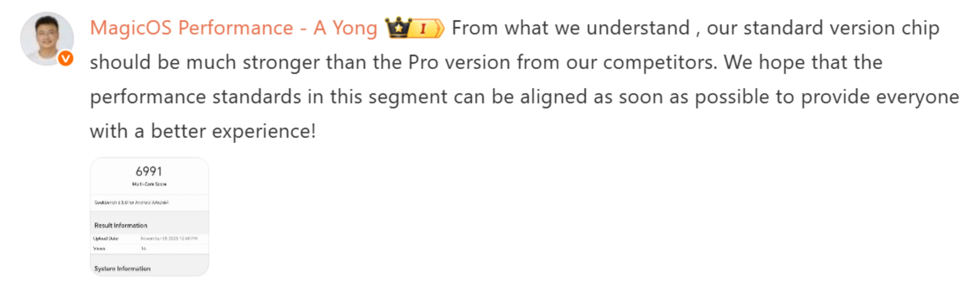 یکی از مهندسان بخش بهینهسازی عملکرد آنر با نام A Yong نیز در تأیید این اطلاعات گفته است که تراشه نسخه استاندارد عملکردی بهمراتب قویتر از مدل پرو برند رقیب یعنی اوپو رینو ۱۵ پرو خواهد داشت. او همچنین ابراز امیدواری کرد که سطح عملکرد در این رده از گوشیها بهسرعت ارتقا یابد تا کاربران تجربهای روانتر و بهتر از کار با دستگاههای خود داشته باشند.