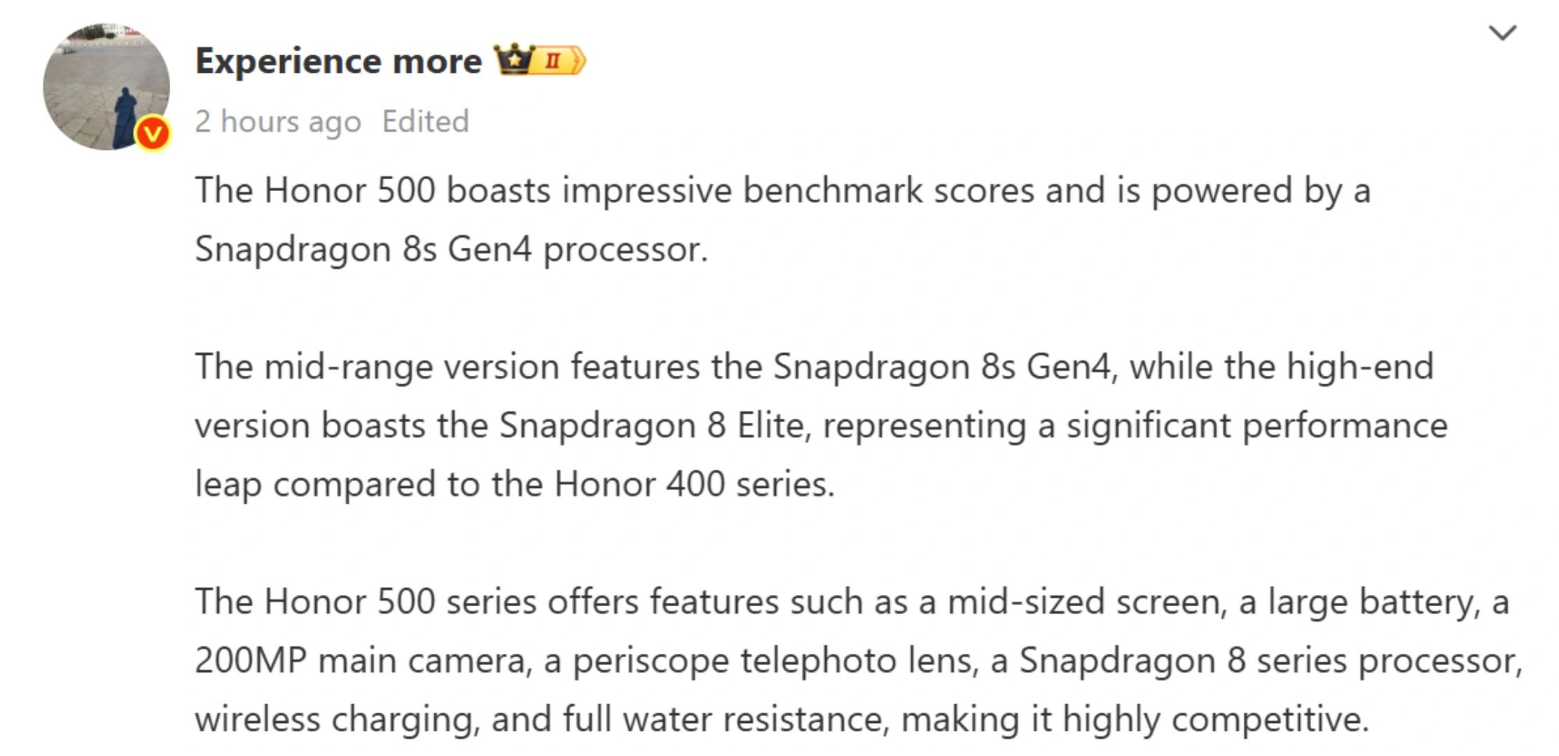 در روزهای اخیر، گوشی جدیدی از آنر با شماره مدل MEY-AN00 در پایگاه داده گیکبنچ مشاهده شد. در ابتدا تصور میشد این مدل متعلق به آنر ۵۰۰ پرو باشد، زیرا از تراشهای از خانواده اسنپدراگون ۸ بهره میبرد. با این حال، پستهای جدیدی در شبکه اجتماعی Weibo از سوی افشاگر معروف Fixed focus Digital و یکی از مهندسان شرکت آنر نشان میدهد که این مدل در واقع نسخه استاندارد است.