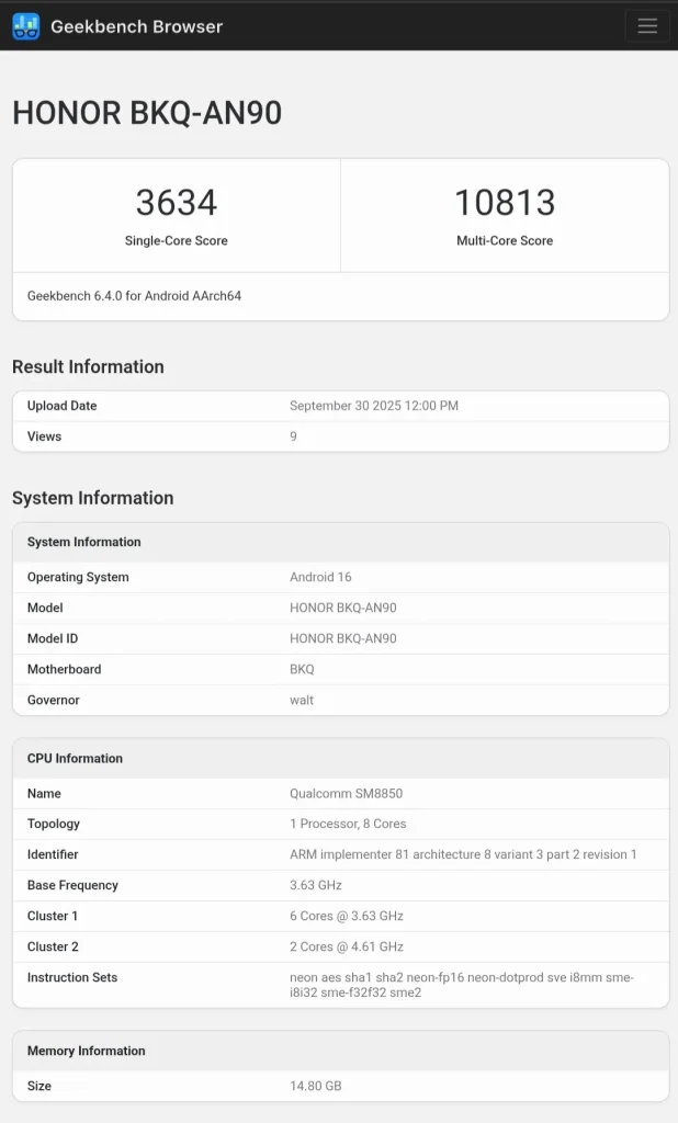طبق گزارشها، سری مجیک ۸ احتمالاً در ماه اکتبر در چین رونمایی خواهد شد. لیست گیکبنچ برای مدل پرو با شماره BKQ-AN90 نشان میدهد که این گوشی در تست تکهستهای امتیاز ۳۶۳۴ و در تست چندهستهای امتیاز ۱۰۸۱۳ را ثبت کرده است. برای مقایسه، Magic 7 Pro سال گذشته با تراشه اسنپدراگون ۸ الیت توانسته بود به ترتیب ۳۰۵۰ و ۹۰۱۹ امتیاز کسب کند. این موضوع نشاندهنده افزایش حدود ۲۰ درصدی عملکرد در نسل جدید نسبت به مدل سال گذشته است.