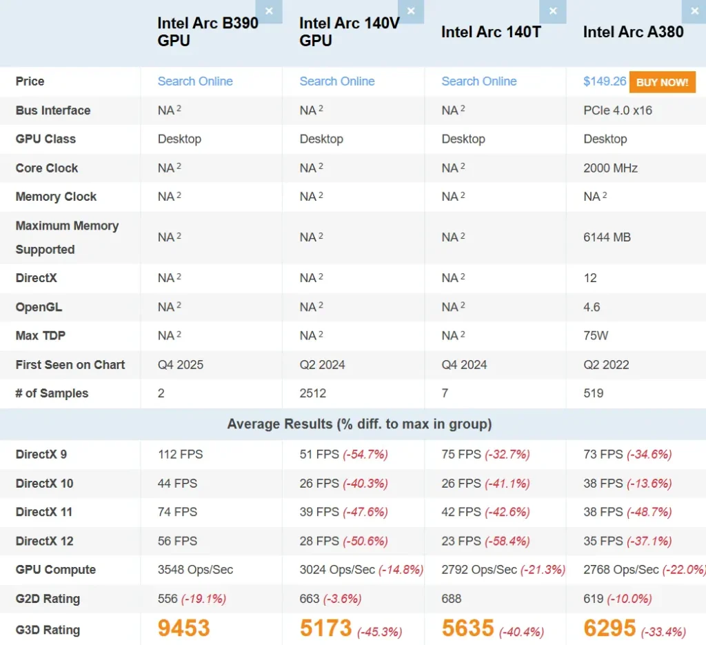 مقایسه اعداد نشان میدهد Arc B390 در برابر iGPUهای نسل قبلی اینتل اختلاف بزرگی ایجاد کرده است. این مدل نسبت به Arc 140V حدود ۸۳ درصد و نسبت به Arc 140T حدود ۶۷ درصد سریعتر عمل میکند. حتی کارت مجزای Arc A380 نیز از آن عقب میماند و B390 حدود ۵۰ درصد عملکرد بهتر نشان میدهد. چنین جهشی برای گرافیک مجتمع در این سطح بسیار قابلتوجه است.