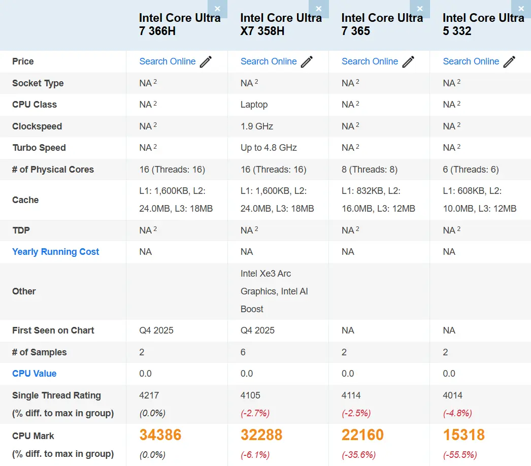 مدل Core Ultra 7 366H دارای ۱۶ هسته با ۱۸ مگابایت کش L3 و ۱۲ مگابایت کش L2 است. مدل Core Ultra X7 358H از همان پیکربندی هسته بهره میبرد اما فرکانس بوست آن ۴.۸ گیگاهرتز است و انتظار میرود iGPU کامل Xe3 با ۱۲ واحد پردازشی داشته باشد. مدل میانرده Core Ultra 7 365 شامل ۸ هسته و مدل Core Ultra 5 332 دارای ۶ هسته است و کش متفاوتی دارد.