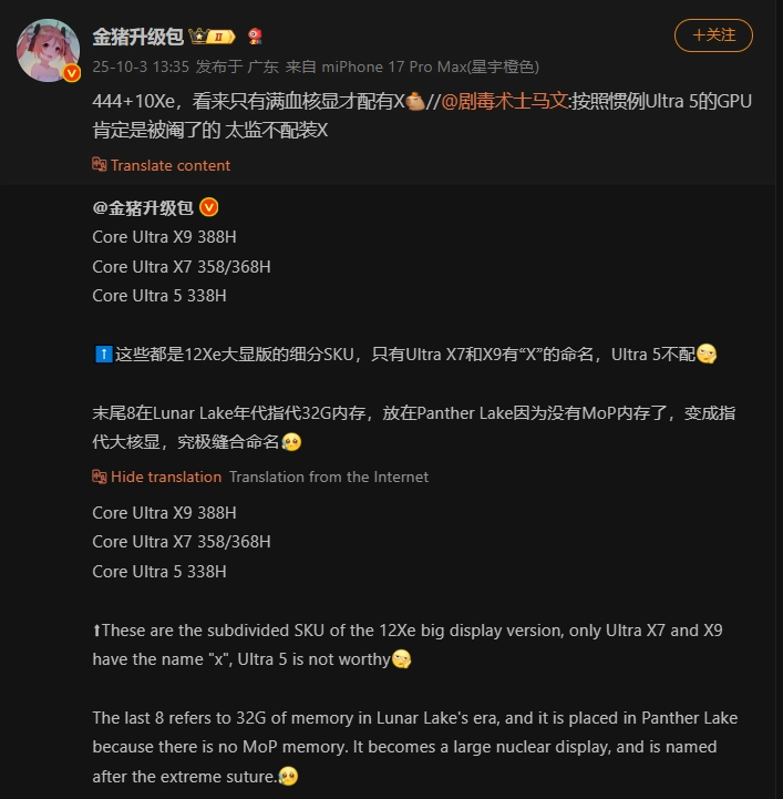 همانطور که میدانید، Panther Lake نخستین نسل از پردازندههای اینتل است که از گرافیک مجتمع مبتنی بر معماری Xe3 یا همان Celestial iGPU بهره میبرد. بر اساس اطلاعات منتشرشده از سوی افشاگر معروف «Golden Pig Upgrade»، مدلهای Core Ultra X7 و X9 قرار است به ۱۲ هستهی گرافیکی Xe3 مجهز شوند و درنتیجه، پرچمداران گرافیکی این نسل محسوب میشوند. در مقابل، تراشههای Core Ultra 5 پسوند «X» را ندارند و همین موضوع نشان میدهد که گرافیک مجتمع آنها ضعیفتر است و از ۱۰ هستهی Xe3 استفاده میکند.