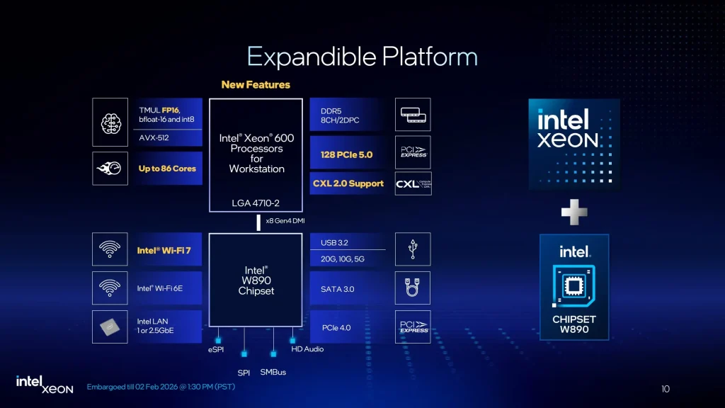 پردازندههای Xeon 600 روی پلتفرم جدید W890 و سوکت LGA 4710-2 نصب میشوند. این پلتفرم از Wi-Fi 7، Wi-Fi 6E، شبکه یک یا ۲.۵ گیگابیتی، USB 3.2 در حالتهای 20G، 10G و 5G، SATA 3.0، PCIe Gen4، HD Audio، eSPI، SPI و SMBus پشتیبانی میکند. ظرفیت حافظه به چهار ترابایت در حالت ۸ کاناله و دو ترابایت در حالت ۴ کاناله میرسد.
