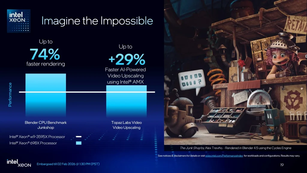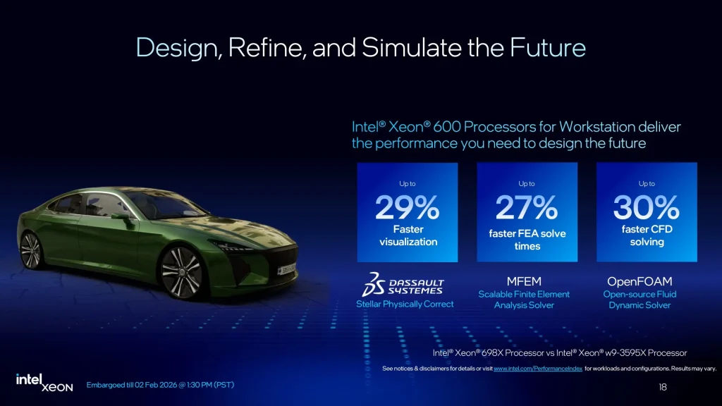 در مقایسه عملکردی، Xeon 698X نسبت به نسل قبل تا ۱۷ درصد در هوش مصنوعی، ۲۲ درصد در انرژی، ۶۱ درصد در خدمات مالی، ۱۹ درصد در علوم زیستی و ۱۰ درصد در رسانه سریعتر است. در بنچمارکها، بهبود ۲۹ درصدی مجازیسازی در Dassault Systèmes، حدود ۲۷ درصدی FEA در MFEM، مقدار ۳۰ درصدی CFD در OpenFOAM، نزدیک ۷۵ درصد رندر Blender و ۲۷ درصدی Upscaling در TopazLabs گزارش شده است. عرضه رسمی این خانواده از اواخر مارس آغاز میشود.