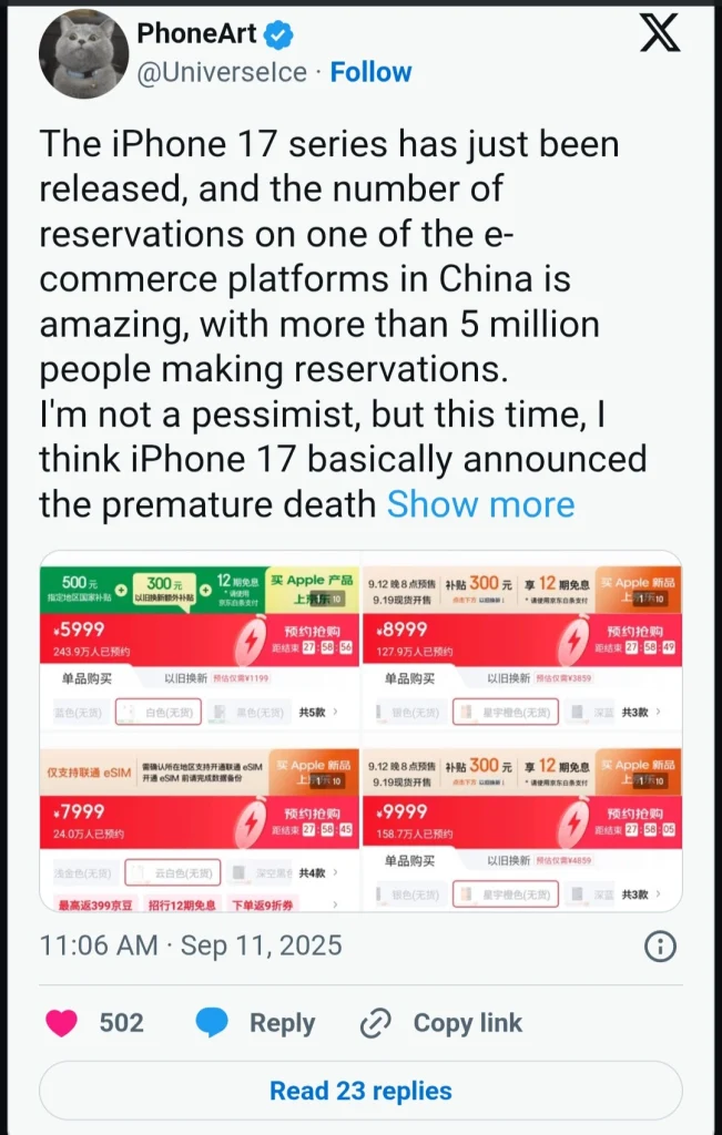 بازاری که هنوز تسلیم اپل است؛ آیفون ۱۷ در چین تنها با یک فروشگاه آنلاین بیش از ۵ میلیون پیش‌خرید گرفت