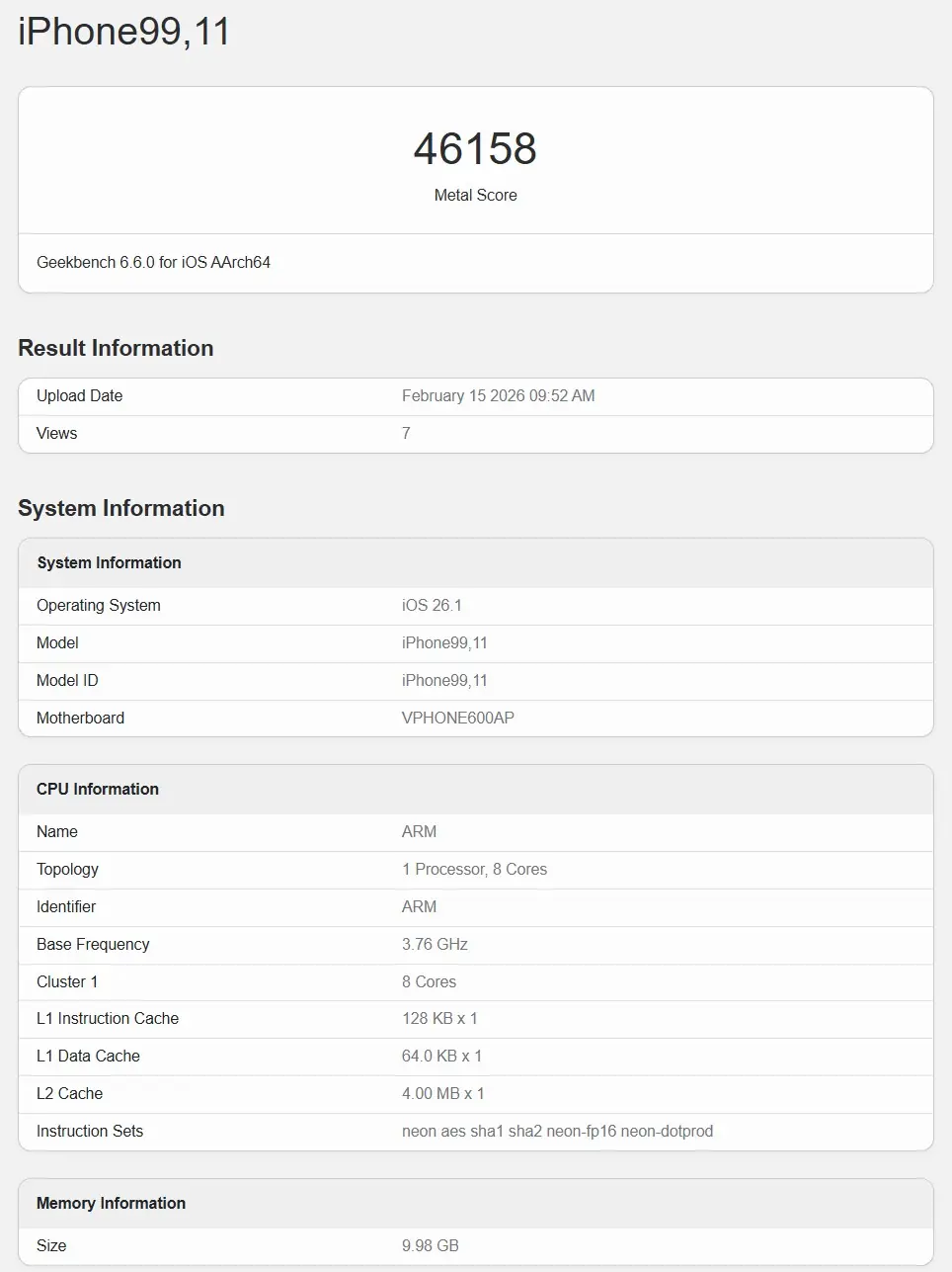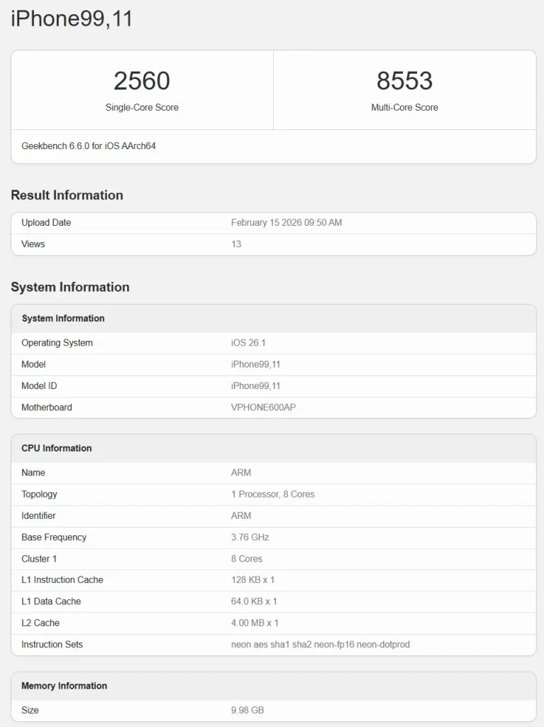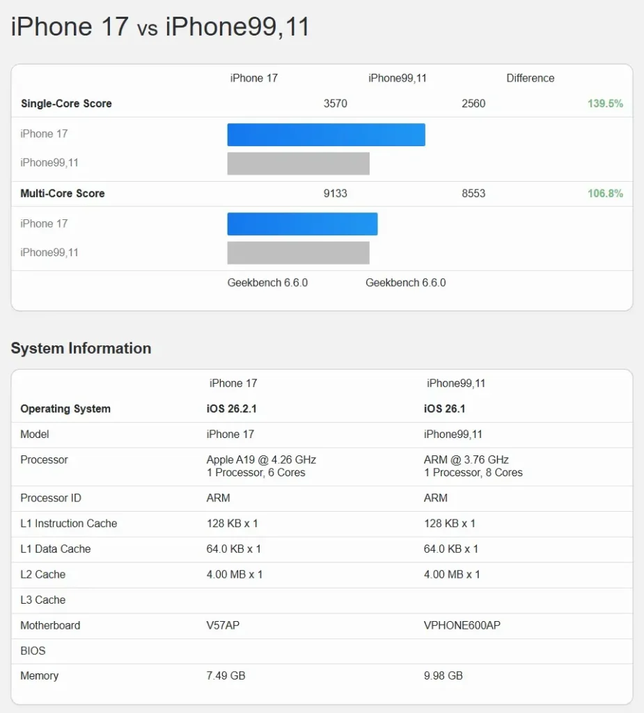 جزئیات حافظه نیز تناقض دیگری را نشان میدهد؛ در بنچمارک میزان رم ۱۰ گیگابایت درج شده، اما پیشبینیها حاکی از استفاده ۸ گیگابایت رم در این مدل هستند. علاوه بر این، نام مادربرد VPHONE600AP اعلام شده، در حالی که آیفون 16e و آیفون 17 بهترتیب با شناسههای V59AP و V57AP معرفی شدهاند و این اختلاف ساختاری قابل توجه است.