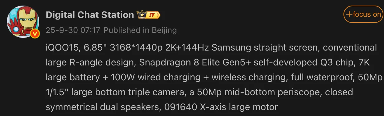گوشی ایکو ۱۵ در آستانه‌ی رونمایی قرار دارد و قرار است با تراشه‌ی Snapdragon 8 Elite Gen 5 عرضه شود. برند سازنده تأیید کرده که این دستگاه از دوربین پریسکوپی تله‌فوتو بهره می‌برد و حتی چند نمونه‌ عکس برای نمایش توانایی زوم آن منتشر کرده است. در کنار این موضوع، مشخصات فنی کامل دستگاه نیز فاش شده و تصویر روشن‌تری از پرچم‌دار آینده‌ی iQoo به دست می‌دهد.