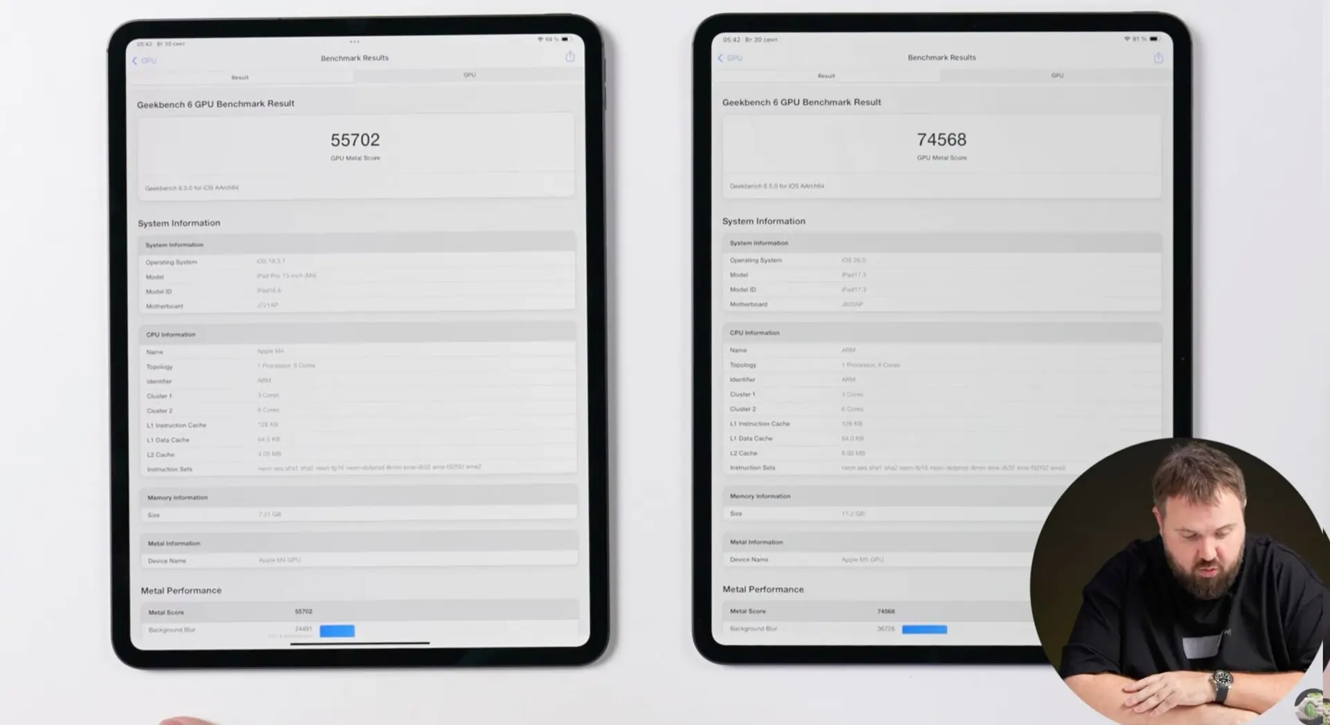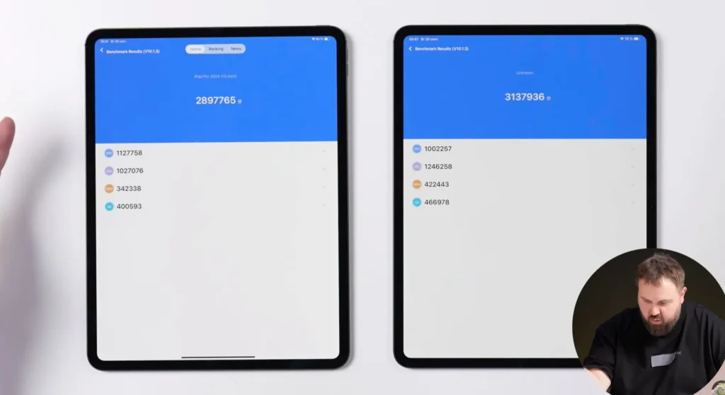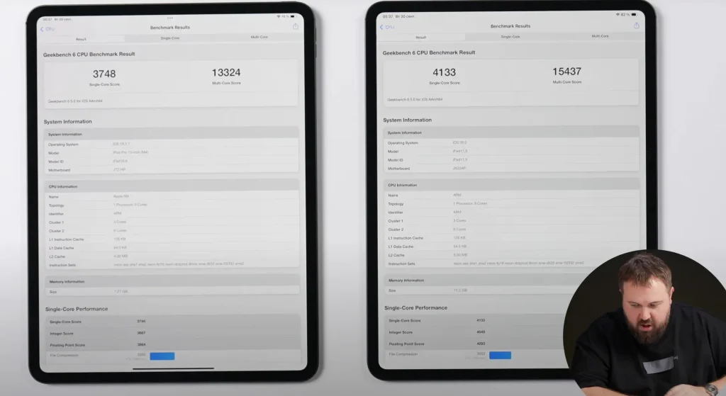 بررسیهای اولیه نشان میدهد آیپد پرو M5 نسبت به نسل قبل پیشرفت داشته، اما تغییرات آن بیشتر تدریجی است تا جهشی. در تست تکهستهای گیکبنچ ۶، عملکرد حدود ده درصد سریعتر از M4 بوده و در چندهستهای نزدیک به ۱۶٪ بهبود ثبت شده است. بیشترین تفاوت در بخش پردازش گرافیکی دیده میشود؛ جایی که امتیاز Metal بیش از ۳۰٪ رشد داشته و نشان میدهد GPU بیشترین سهم را در ارتقا دارد. در مقابل، نتیجه در آزمون AnTuTu افزایش نسبتاً محدودی در حدود ۸٪ را نشان میدهد.