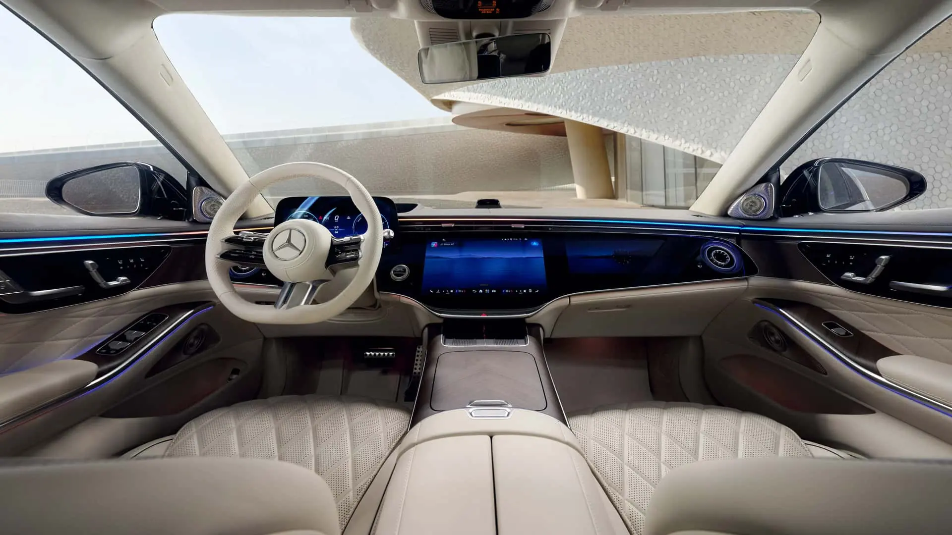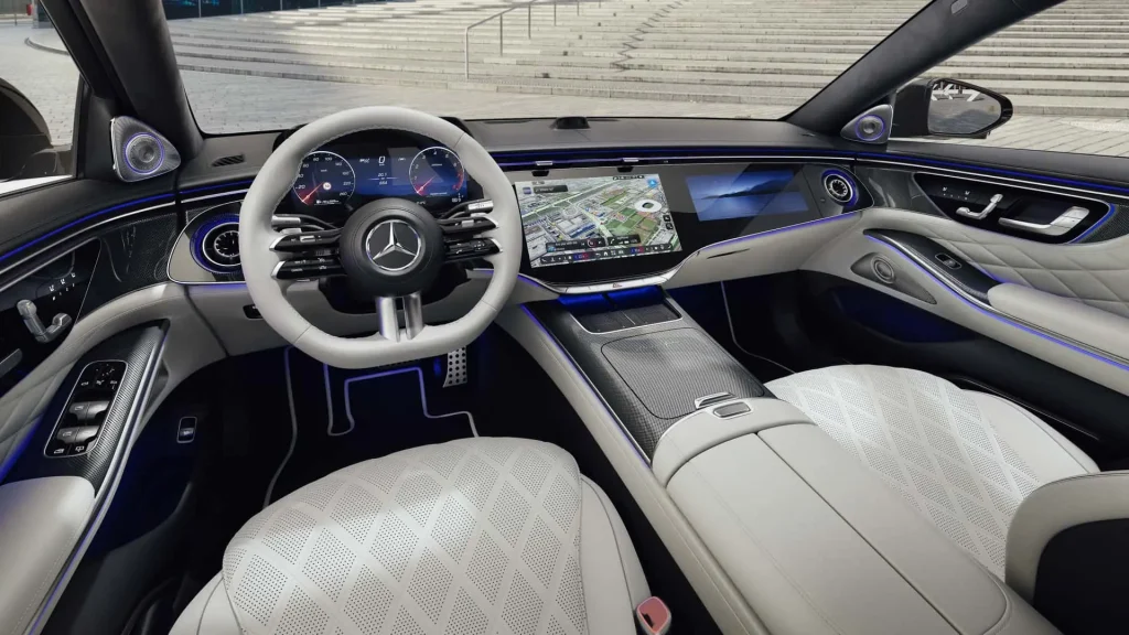 کابین S Class 2027 با حذف هایپراسکرین یکپارچه و معرفی سوپراسکرین بازطراحی شده است؛ مجموعه‌ای شامل نمایشگر دیجیتال ۱۲.۳ اینچی پشت فرمان، صفحه‌نمایش مرکزی ۱۴.۳ اینچی و نمایشگر ۱۲.۳ اینچی سرنشین جلو. سیستم جدید MBUX اکنون از هوش مصنوعی مولد و ادغام مستقیم با گوگل مپس بهره می‌برد. در عقب نیز دو نمایشگر ۱۳.۱ اینچی و ریموت‌های جداشدنی MBUX همراه با پشتیبانی بومی Disney+ و YouTube قرار دارند.