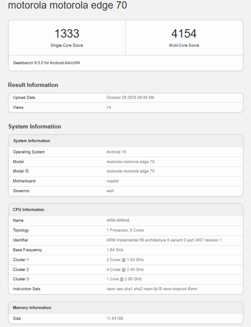 در بخش سختافزار، موتورولا از تراشه اسنپدراگون ۷ نسل ۴ استفاده کرده که با ۱۲ گیگابایت رم LPDDR5X و حافظه داخلی ۵۱۲ گیگابایت از نوع UFS 3.1 همراه است. بر اساس دادههای منتشرشده در پلتفرم گیکبنچ ، عملکرد پردازندهی Edge 70 در سطح چیپست دایمنسیتی ۸۳۵۰ بهکاررفته در اج ۶۰ پرو قرار دارد.