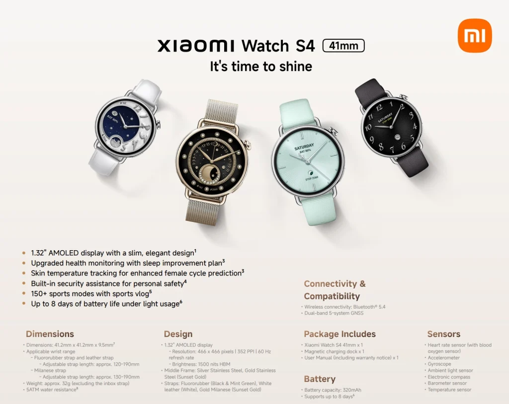 ساعت هوشمند شیائومی Watch S4 با اندازه ۴۱ میلی‌متر ابتدا در ژوئن ۲۰۲۵ در چین عرضه شد و حالا این شرکت آن را به بازار جهانی هم آورده است. این ساعت جمع‌وجور به نمایشگر ۱.۳۲ اینچی AMOLED مجهز است و عمر باتری آن تا ۸ روز تخمین زده می‌شود. در اروپا، قیمت پایه این ساعت ۱۵۹.۹۹ یورو و نسخه مجهز به بند میلانس ۲۱۹.۹۹ یورو است.