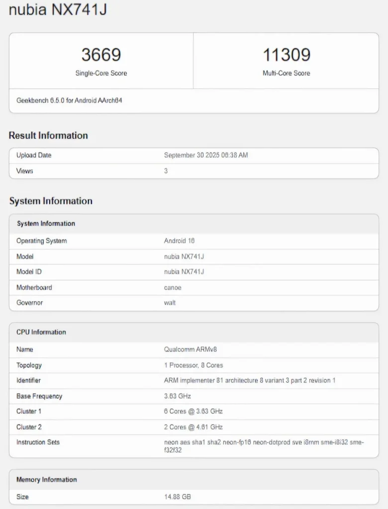 با معرفی رسمی تراشه اسنپدراگون ۸ الیت نسل ۵، حالا سازندگان اندرویدی آماده رونمایی از پرچمداران جدید خود با این چیپست هستند. یکی از این برندها نوبیا است که گوشی Z80 Ultra (NX741J) آن در فهرست گیکبنچ ظاهر شده است. این دستگاه با تراشهی جدید کوالکام توانسته امتیاز تکهستهای ۳۶۶۹ و چندهستهای ۱۱۳۰۹ را ثبت کند. همچنین دستگاه به ۱۶ گیگابایت رم و اندروید ۱۶ مجهز است.