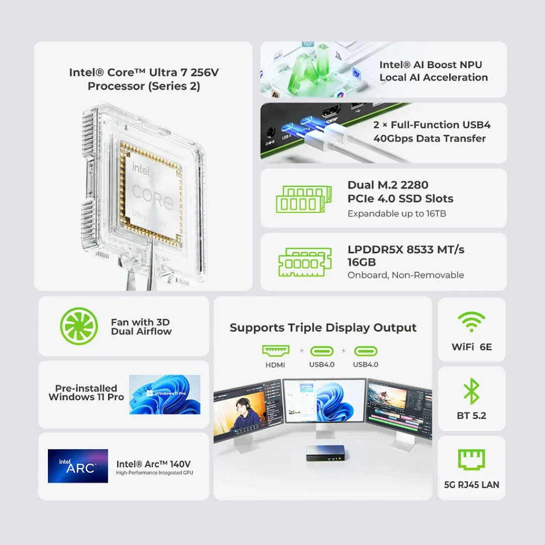 این مینیپیسی از ۱۶ گیگابایت حافظه LPDDR5X با سرعت ۸۵۳۳ MT/s بهره میبرد که برای اجرای برنامههای سنگین و بازیها کافی است. فضای ذخیرهسازی دستگاه نیز از طریق دو اسلات PCIe 4.0 NVMe 2280 قابل ارتقا تا ۱۶ ترابایت است. این قابلیتها انعطافپذیری بالایی برای کاربران حرفهای فراهم میکند و امکان مدیریت دادهها و برنامهها با سرعت بالا را در کنار اجرای چندوظیفگی همزمان ممکن میسازد.