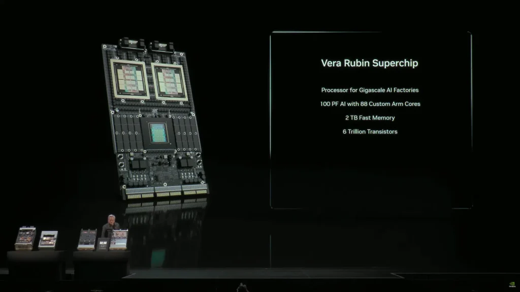 جن سون هوانگ، مدیرعامل انویدیا اعلام کرد که نمونههای اولیهی GPU های Rubin در حال حاضر در آزمایشگاهها مورد بررسی قرار دارند. به گفتهی او، این نخستین تراشههای تولیدشده در کارخانهی TSMC تایوان هستند. هر GPU توسط مدارهای قدرتمند تغذیهی برق احاطه شده و شامل هشت ماژول حافظهی HBM4 و دو قالب GPU با ابعاد ریتیکل است. پردازندهی Vera CPU نیز با ۸۸ هستهی اختصاصی ARM و ۱۷۶ رشتهی پردازشی طراحی شده است.