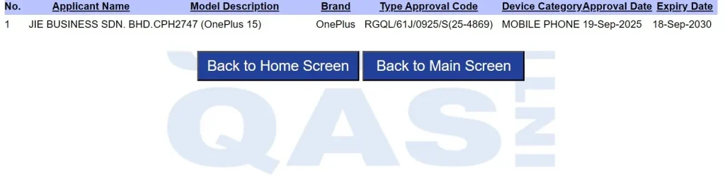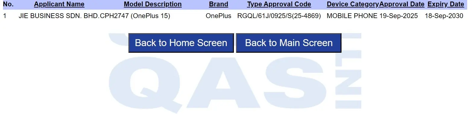 طبق گزارش XpertPick وان‌پلاس ۱۵ توسط SIRIM در مالزی تأییدیه دریافت کرده و شماره مدل آن CPH2747 است. پیش‌تر همین نسخه CPH2747 تأییدیه TÜV SÜD را گرفته بود که پشتیبانی از شارژ ۱۲۰ واتی را نشان می‌داد. در آن زمان هنوز مشخص نبود که این شماره مدل به وان‌پلاس ۱۵ مربوط می‌شود، اما با تأییدیه جدید SIRIM حالا روشن است که CPH2747 همان مدل جهانی OnePlus 15 است.