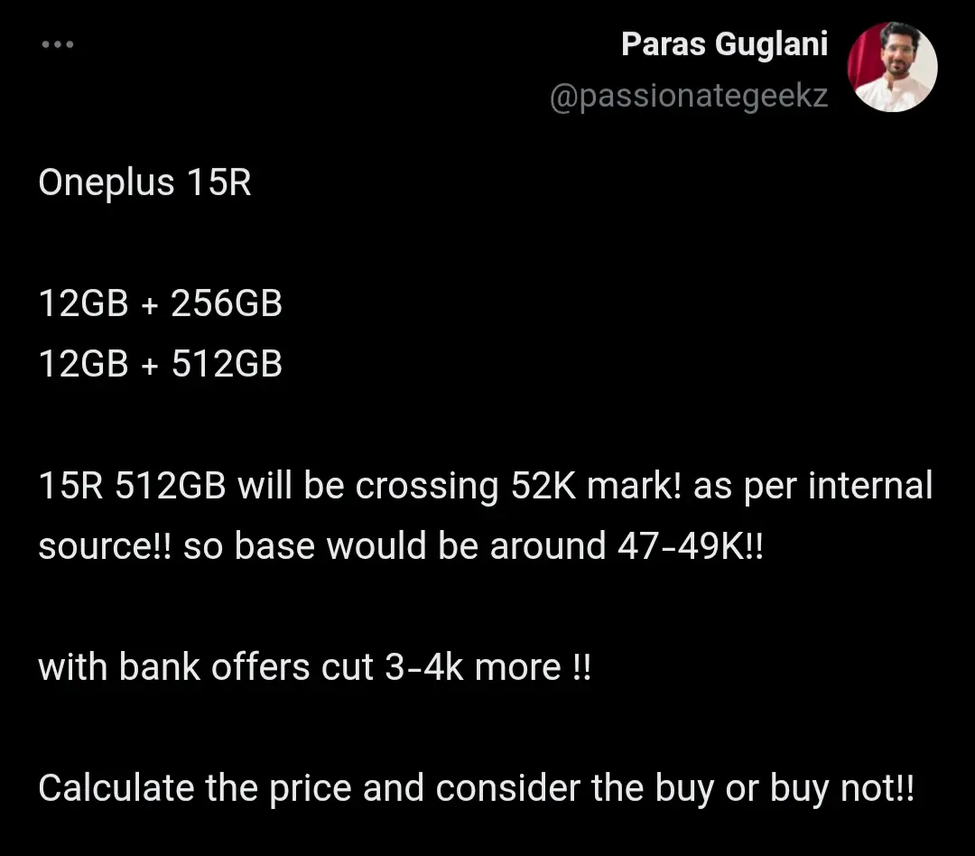 وان‌پلاس خود را برای معرفی وان‌پلاس 15R در تاریخ ۱۷ دسامبر ۲۰۲۵ (۲۶ آذر ۱۴۰۴) آماده می‌کند و افشاگری‌های جدید، جزئیات مهمی از حافظه و قیمت احتمالی این گوشی در بازار هند را فاش کرده‌اند. این مدل قرار است هم‌زمان با چند محصول دیگر وان‌پلاس معرفی شود و بخشی از برنامه عرضه جهانی این برند در پایان سال آینده باشد.