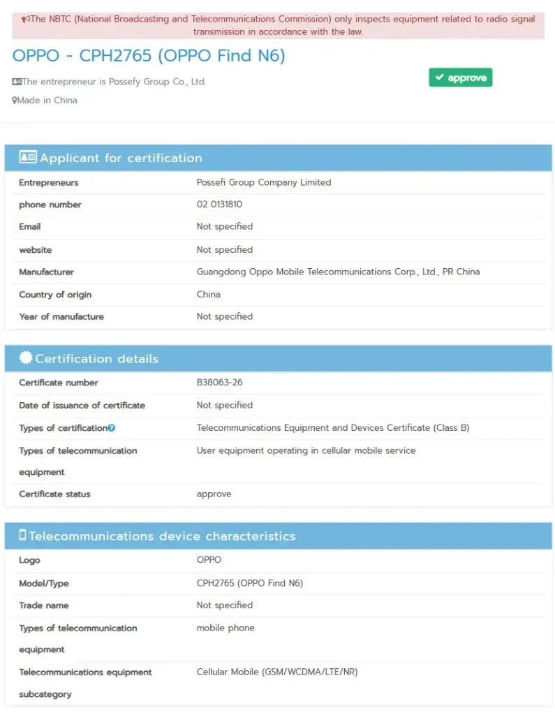 اوپو Find N6 با شماره مدل CPH2765 موفق به دریافت تأییدیه کمیسیون ملی پخش و مخابرات تایلند یا NBTC شده است. طبق روال معمول این پایگاه، اطلاعات فنی یا مشخصات سختافزاری در این فهرست منتشر نشده، اما همین ثبت رسمی تأیید میکند که تایلند یکی از بازارهای هدف این گوشی تاشو خواهد بود و عرضه آن در این کشور قطعی است.