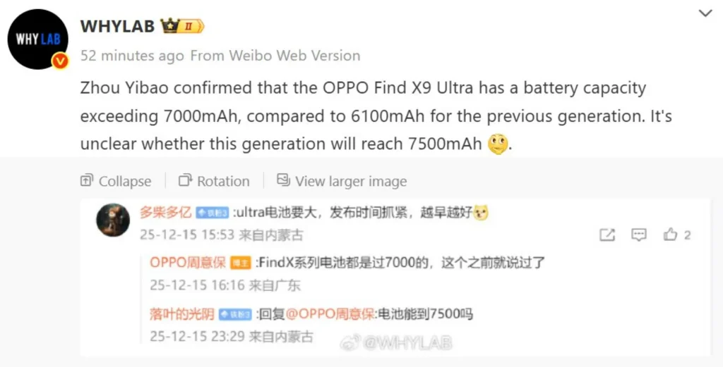 ماجرا از جایی شروع شد که یکی از کاربران در ویبو مستقیماً از ژو ییبائو درباره ظرفیت باتری پرچمدار اوپو سؤال کرد و او در پاسخ تنها از عبارت بهطور بیسابقه قدرتمند استفاده کرد. این پاسخ مبهم اما تحریککننده، خیلی زود با یک پست دیگر تکمیل شد؛ جایی که این مدیر اوپو تأیید کرد ظرفیت باتری این گوشی بهمراتب بالاتر از ۷۰۰۰ میلیآمپر ساعت خواهد بود. پیشتر نیز افشاگر شناختهشده Smart Pikachu ادعا کرده بود Find X9 Ultra بزرگترین باتری را در میان تمام گوشیهای اولترا خواهد داشت.