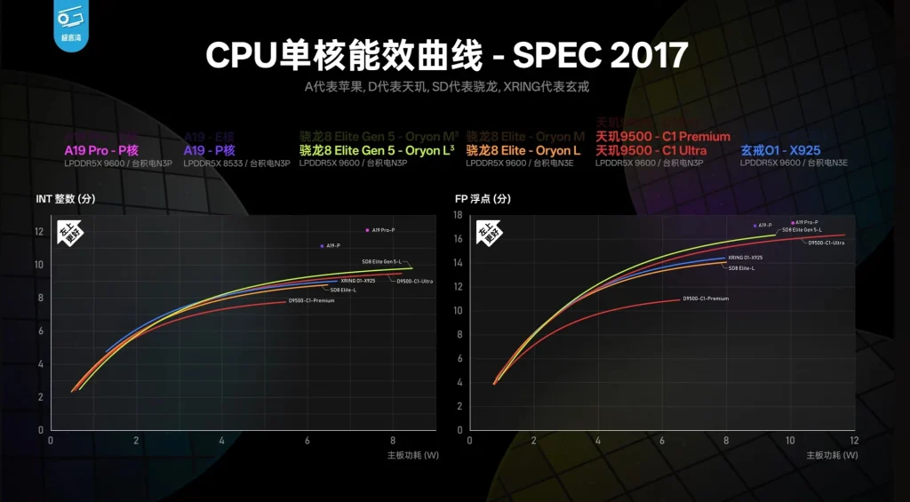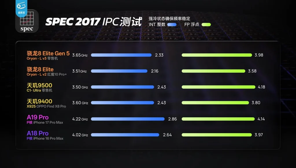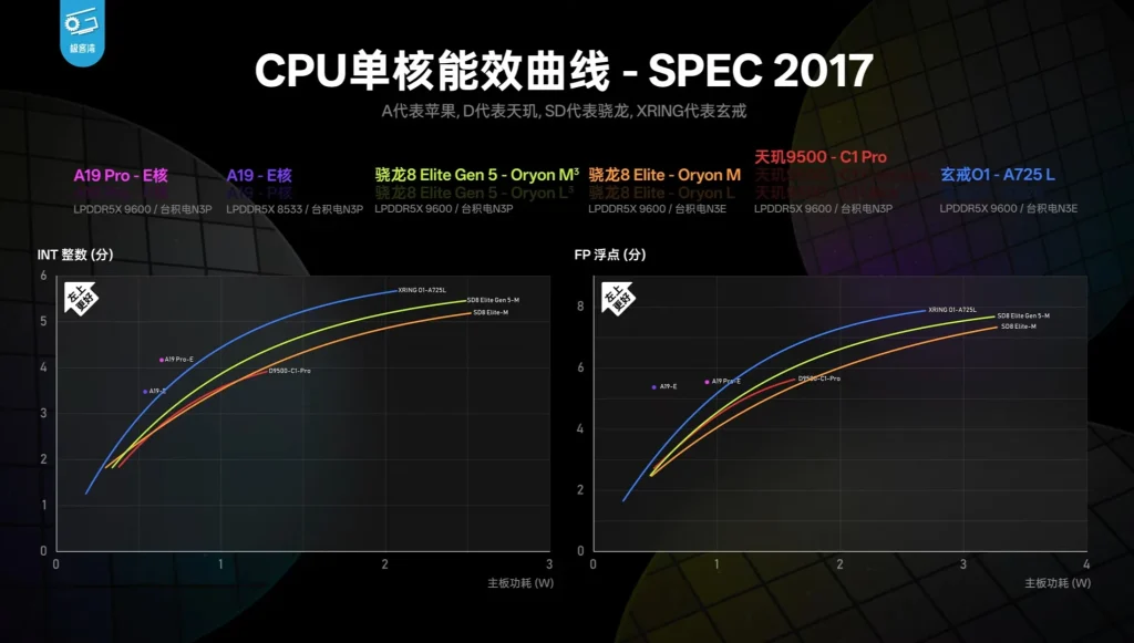 در تست SPEC 2017 برای هسته های پرفورمنس پردازنده های اپل، A19 Pro و A19 در INT هنوز بهترین عملکرد را ارائه می‌دهد و با اختلاف چشمگیر، اسنپدراگون ۸ الیت نسل ۵ قرار می‌گیرد و سپس با اختلاف کم دایمنسیتی ۹۵۰۰ و XRING O1 قرار دارد. در معیار FP رتبه‌بندی ها حفظ می‌شود اما پرچمدار کوالکام می‌تواند اختلاف را با پرچمداران اپل کم کند و از آن طرف اختلاف با دایمنسیتی ۹۵۰۰ و XRING O1 بیشتر می‌شود.