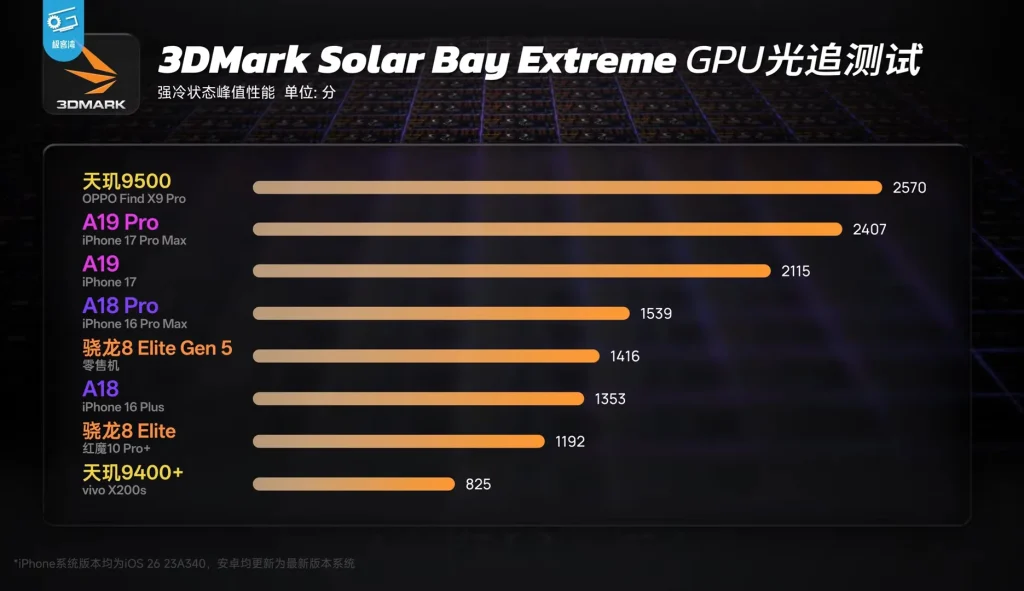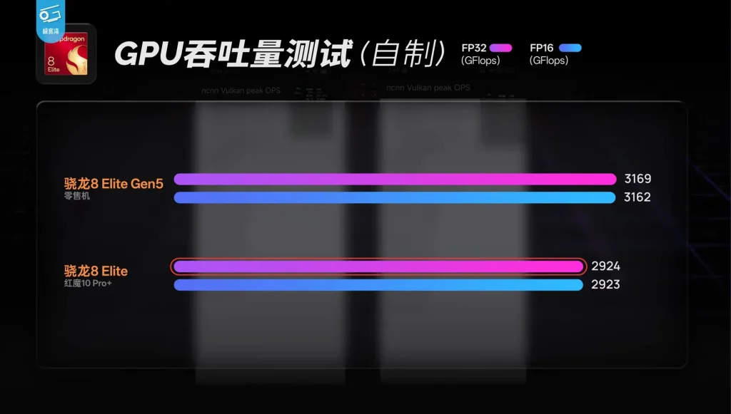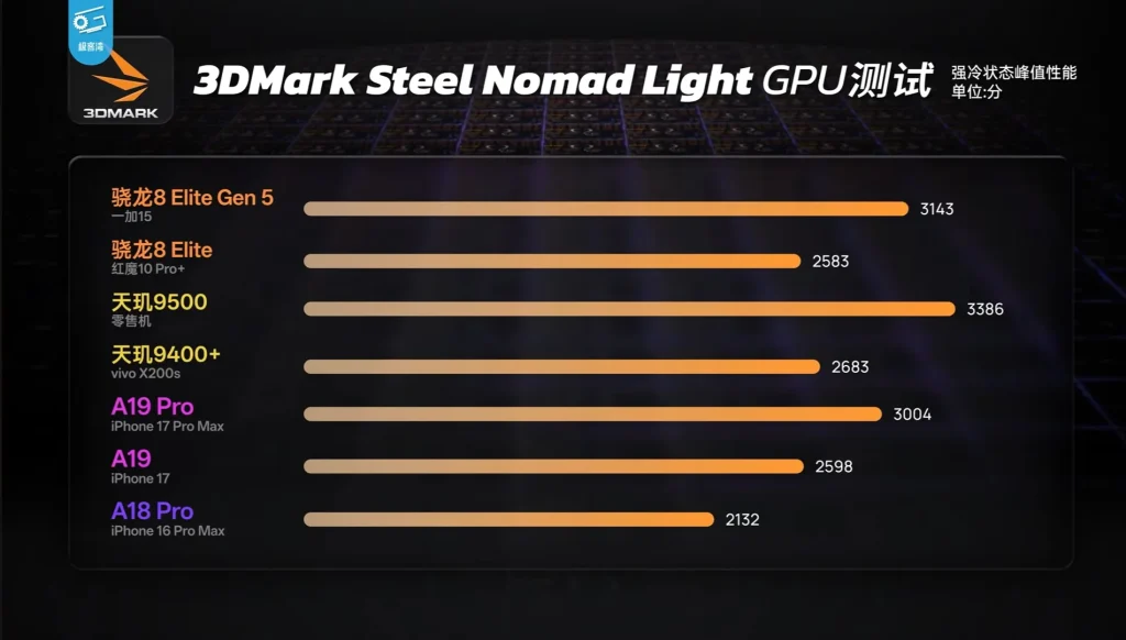 در بخش گرافیک Adreno GPU نیز ارتقای چشمگیری تجربه کرده است. در تست 3DMark Steel Nomad Light تراشه امتیاز ۳۱۴۳ به‌دست آورده؛ بالاتر از ۲۵۸۳ امتیاز نسل قبل و نزدیک به ۳۳۸۶ گزارش‌شده برای دایمنسیتی. این نتایج نشان می‌دهد Adreno در بارهای سبک و میان‌رده عملکردی بسیار رقابتی و بهینه از نظر مصرف انرژی دارد. با این حال، در آزمون سنگین‌تر Solar Bay Extreme با امتیاز ۱۴۱۶ پایین‌تر از نماینده مدیاتک با ۲۵۷۰ و اپل با ‌۲۴۰۷ امتیاز قرار می‌گیرد؛ نشانه‌ای از تمرکز روی کارایی انرژی‌محور در وظایف روزمره به جای بیشینه‌سازی عملکرد در بارهای بسیار سنگین.