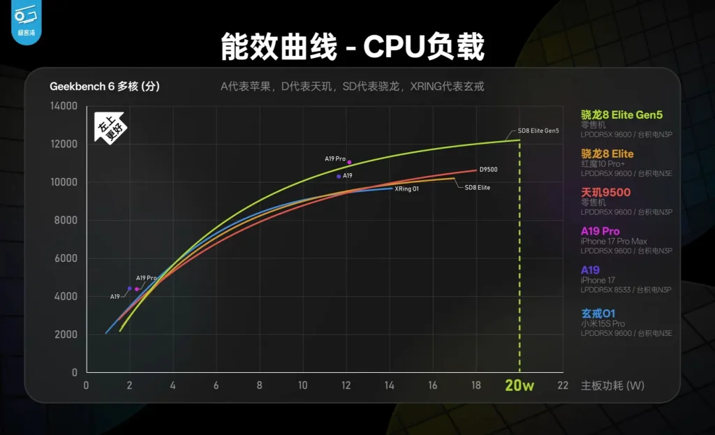البته که این نمودار نشان‌ دهنده‌ی برتری عملکرد بر مصرف A19 Pro نسب‌ به تمام پردازنده های نام برده است، هرچنبا اختلاف کم با پرچمدار کوالکام، لازم به ذکر است که پرچمدار کوالکام حدود ۱۰٪ حداکثر قدرت بیشتری نسبت به A19 Pro در CPU دارد ولی این برتری با ۶۶٪ مصرف بیشتر ممکن شده و در صورتی که مصرف اسنپدراگون ۸ الیت نسل ۵ به اندازه حداکثر مصرف پرچمدار اپل محدود شود این برتری به ضعف قدرت ۲٪ تبدیل می‌شود.