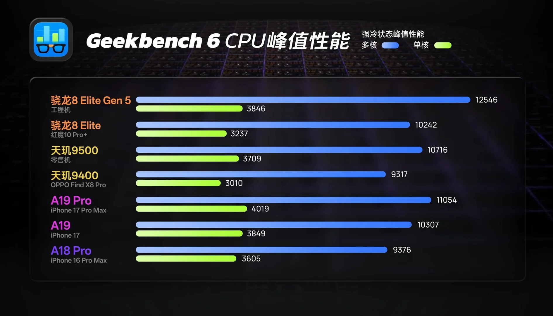 در آزمون گیک‌بنچ هنگام بررسی اسنپدراگون ۸ نسل ۵، تراشه امتیاز ۳۸۴۶ در تک‌هسته و ۱۲۵۴۶ در چند‌هسته کسب کرده است؛ اعدادی که به‌ویژه در عملکرد چند‌هسته‌ای فاصله‌ای قابل توجه با نسل گذشته و رقبایی مانند A19 ایجاد می‌کنند. برای مثال، A19 چند‌هسته‌ای حدود ۱۰۳۰۷ ثبت کرده و نسل قبلی اسنپ دراگون نزدیک به ۱۰۲۴۲ بوده است. نمودار کارایی در برابر مصرف انرژی نشان می‌دهد در بازهٔ مصرف زیر ۱۰ وات، پرچمدار کوالکام از A19، دایمنسیتی ۹۵۰۰ و XRING O1 پیشی می‌گیرد و در بارهای بالاتر تا نزدیک ۱۲۰۰۰ امتیاز عمل می‌کند.