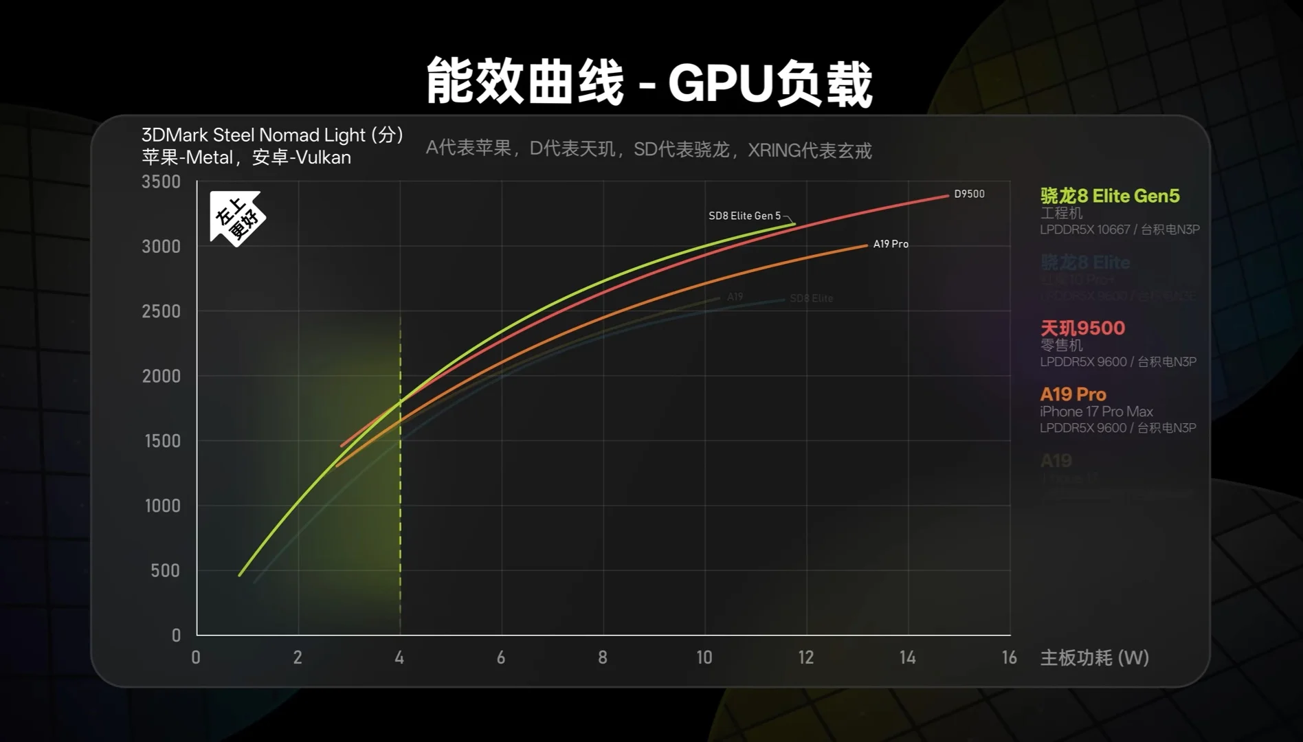 البته که این نمودار نشان‌ دهنده‌ی برتری عملکرد بر مصرف A19 Pro نسب‌ به تمام پردازنده های نام برده است، هرچنبا اختلاف کم با پرچمدار کوالکام، لازم به ذکر است که پرچمدار کوالکام حدود ۱۰٪ حداکثر قدرت بیشتری نسبت به A19 Pro در CPU دارد ولی این برتری با ۶۶٪ مصرف بیشتر ممکن شده و در صورتی که مصرف اسنپدراگون ۸ الیت نسل ۵ به اندازه حداکثر مصرف پرچمدار اپل محدود شود این برتری به ضعف قدرت ۲٪ تبدیل می‌شود.