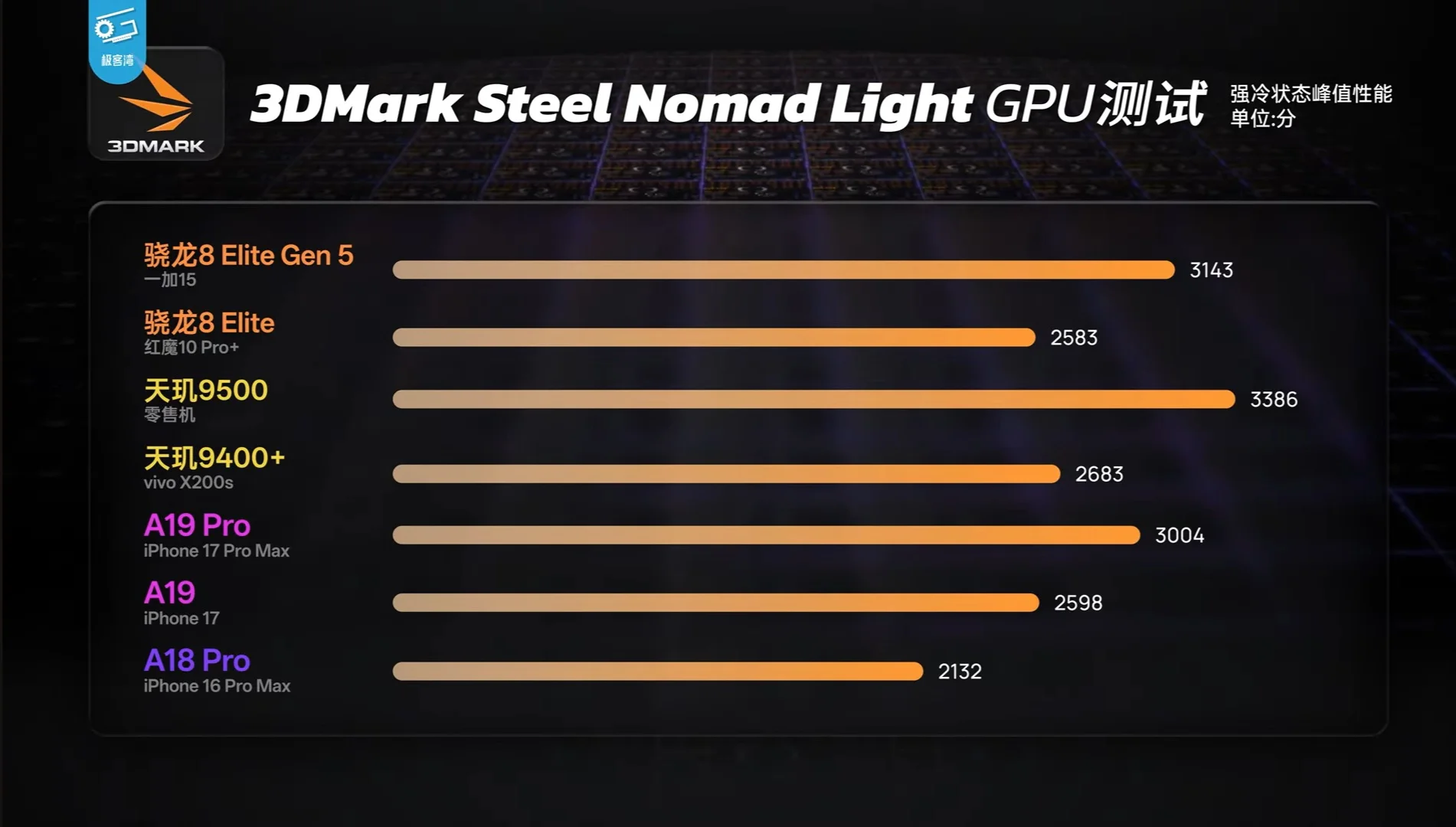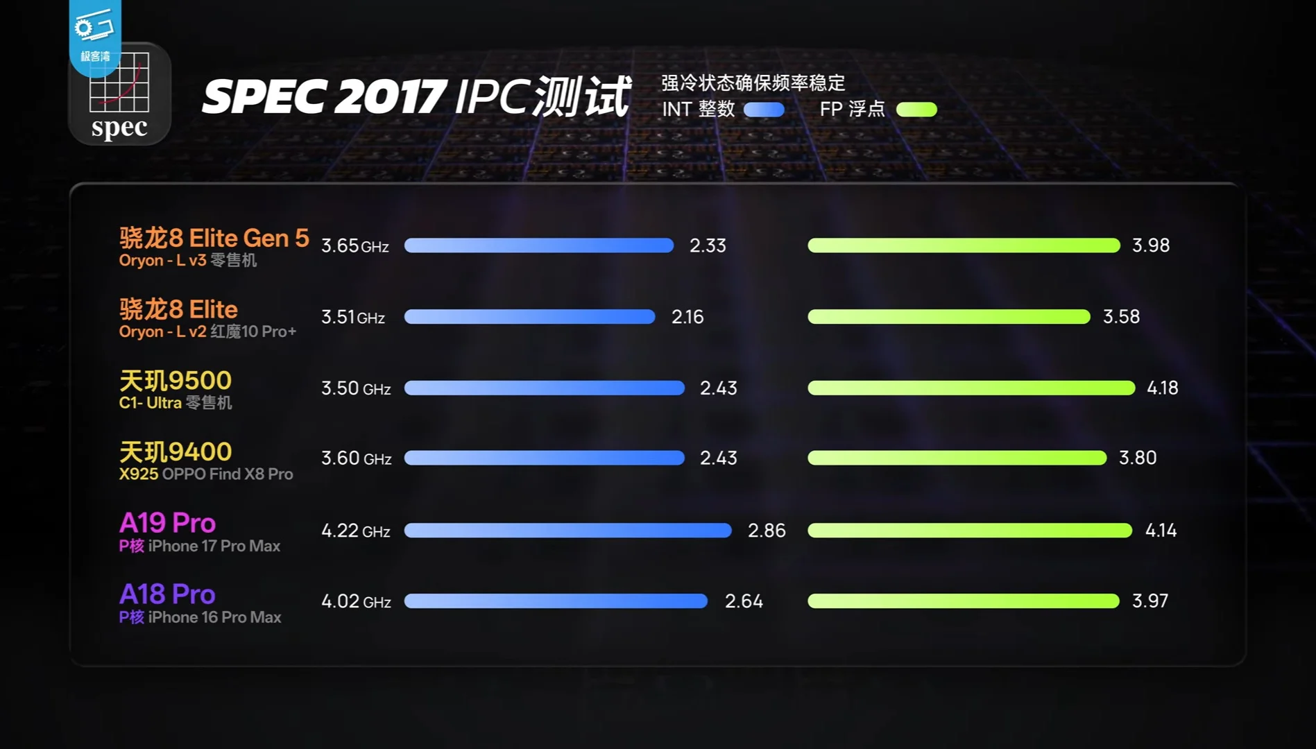 در تست SPEC 2017 برای هسته های پرفورمنس پردازنده های اپل، A19 Pro و A19 در INT هنوز بهترین عملکرد را ارائه می‌دهد و با اختلاف چشمگیر، اسنپدراگون ۸ الیت نسل ۵ قرار می‌گیرد و سپس با اختلاف کم دایمنسیتی ۹۵۰۰ و XRING O1 قرار دارد. در معیار FP رتبه‌بندی ها حفظ می‌شود اما پرچمدار کوالکام می‌تواند اختلاف را با پرچمداران اپل کم کند و از آن طرف اختلاف با دایمنسیتی ۹۵۰۰ و XRING O1 بیشتر می‌شود.