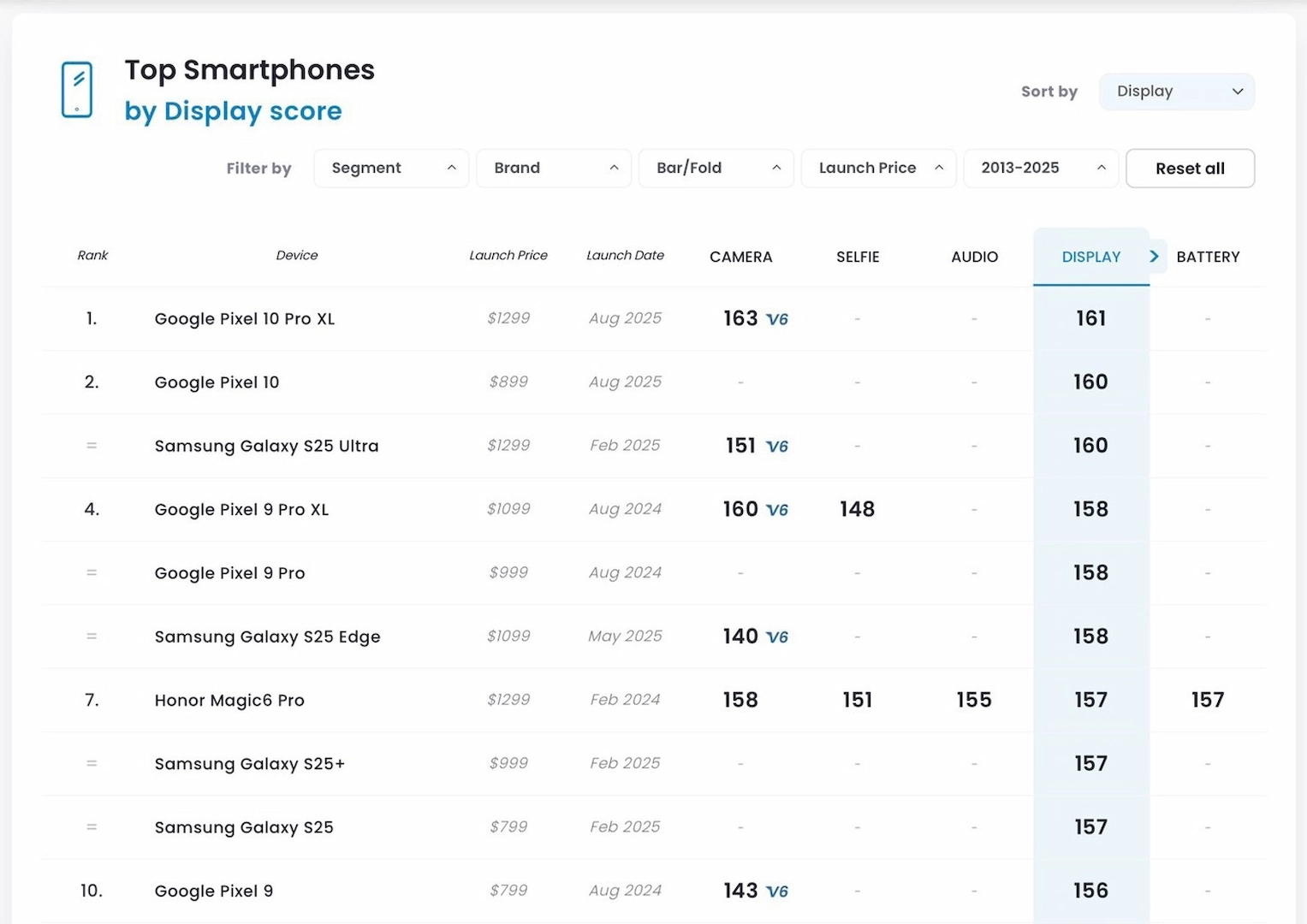 از نظر لمس نیز هر دو مدل با دقت و واکنشپذیری بالا عمل میکنند. البته، کاستیهایی هم وجود دارد. پیکسل ۱۰ پرو XL در برخی زوایای دید دچار تغییر رنگ میشود، در حالی که پیکسل ۱۰ گاهی در تشخیص لمس ناخواسته کف دست با مشکل مواجه است. با وجود این موارد، عملکرد کلی نمایشگرهای این دو گوشی باعث شده در صدر جدول DxOMark قرار گیرند؛ جایگاهی که احتمالاً تا انتشار نتایج مربوط به آیفون ۱۷ حفظ خواهد شد. البته عداهی زیادی از دنبال کنندگان اخبار فناوری بررسی های دگزومارک را فاقد اعتبار میدانند.