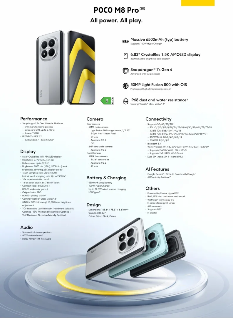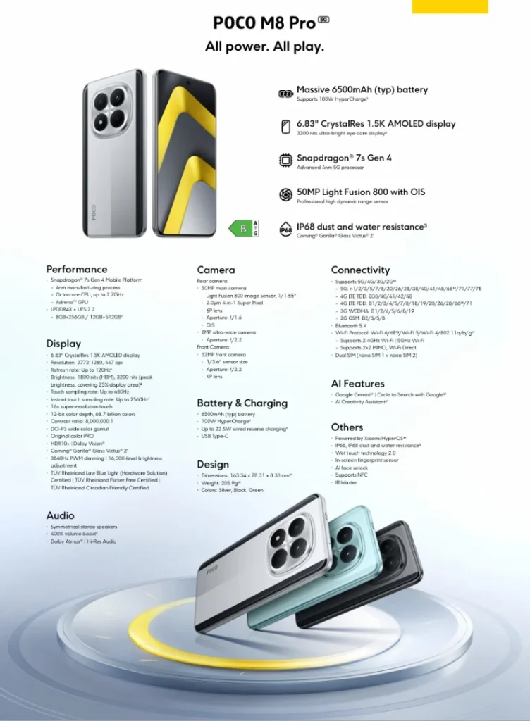 در بخش پردازنده، شیائومی برای Poco M8 Pro 5G به سراغ تراشه کوالکام رفته و از اسنپدراگون ۷اس نسل ۴ استفاده کرده. این چیپست در کنار حداکثر ۱۲ گیگابایت رم و ۵۱۲ گیگابایت حافظه داخلی، عملکردی مناسب برای کاربری روزمره و نیمه‌حرفه‌ای ارائه می‌دهد. این ترکیب سخت‌افزاری نسبت به نسل قبل، بهبود محسوسی در قدرت پردازشی و مدیریت مصرف انرژی دارد.