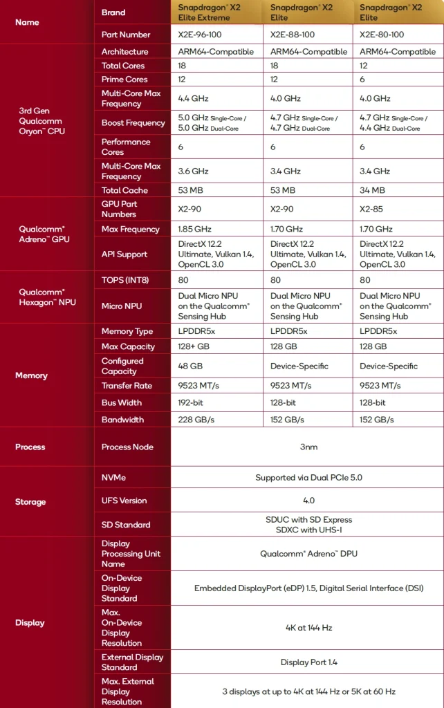پردازندههای Snapdragon X2 بر پایه فناوری تولید ۳ نانومتری TSMC ساخته شدهاند و دارای هستههای CPU نسل سوم Oryon، هستههای جدید GPU Adreno و NPU جدید Hexagon هستند. این خانواده در دو مدل X2 Elite و X2 Elite Extreme عرضه میشود. نسخه پرچمدار Extreme دارای ترکیبی هیبریدی از ۱۸ هسته است؛ شامل ۱۲ هسته Prime با فرکانس بوست تکهستهای و دو هستهای ۵.۰ گیگاهرتز و فرکانس بوست تمامهسته ۴.۴ گیگاهرتز و ۶ هسته Performance با حداکثر فرکانس تمامهسته ۳.۶ گیگاهرتز. این تراشه از ۵۳ مگابایت کش، GPU Adreno با فرکانس ۱.۸۵ گیگاهرتز و NPU با توان محاسباتی تا ۸۰ تاپس بهره میبرد و حافظه داخلی LP5X با ۱۲ کانال و پهنای باند ۲۲۸ گیگابایت بر ثانیه دارد.