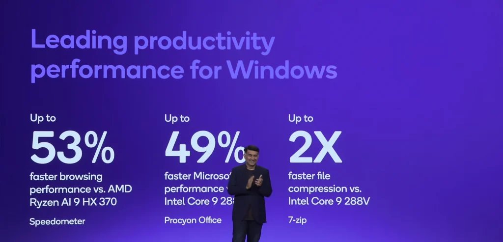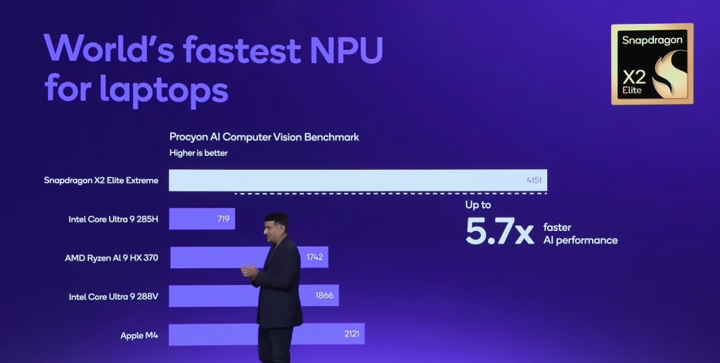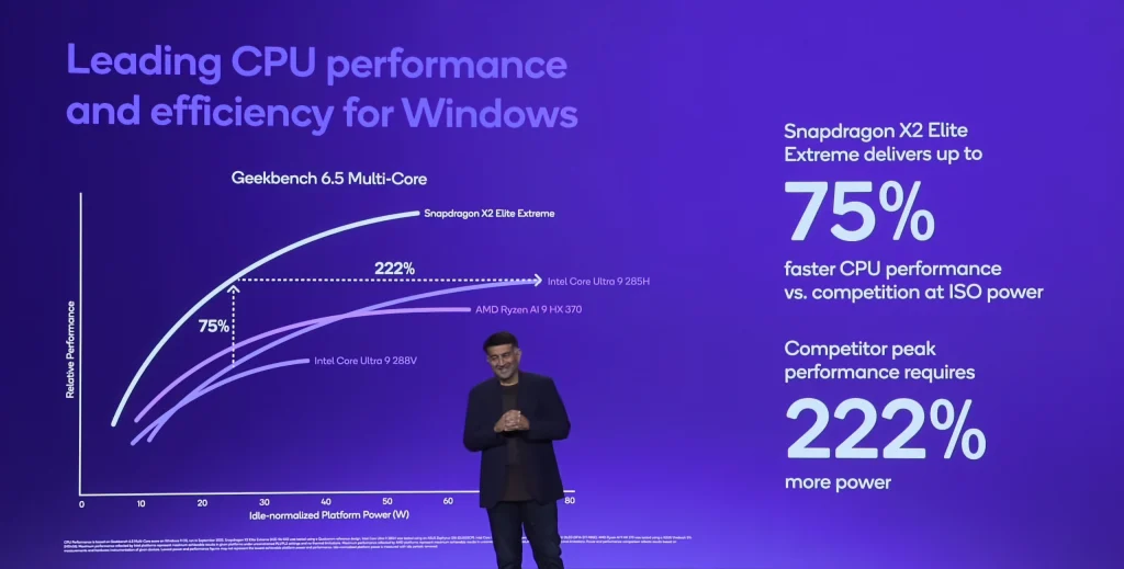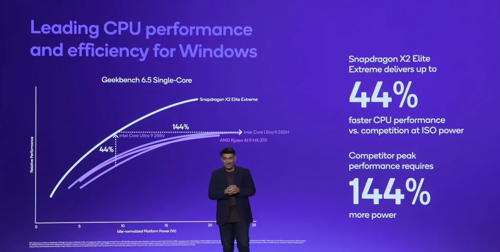 کوالکام در ارائه رسمی خود، اسلایدهایی از عملکرد پردازندههای X2 منتشر کرد که نشان میدهد این تراشهها در مقایسه با نسل قبل، یعنی Snapdragon X1، در تکهستهای تا ۳۹٪ و در چند هستهای تا ۵۰٪ سریعتر هستند و عملکرد GPU پیک تا ۲.۳ برابر و NPU پیک تا ۷۸٪ بهبود یافته است. سپس این شرکت پردازنده پرچمدار X2 Elite را با تراشههای اینتل و AMD مانند Core Ultra 9 285H “Arrow Lake-H”، Ryzen AI 9 HX 370 “Strix” و Core Ultra 9 288V “Lunar Lake” مقایسه کرد.