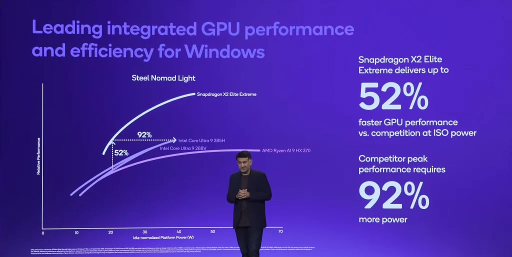 کوالکام همچنین نتایج دنیای واقعی را ارائه داده و ادعا میکند مرور وب با این تراشه تا ۵۳٪ سریعتر از AMD Ryzen AI 9 HX 370 و اجرای Microsoft 365 تا ۴۹٪ سریعتر از Intel Core Ultra 9 288V انجام میشود. فشردهسازی دادهها نیز تا دو برابر سریعتر است. در بخش گرافیک، GPU Adreno X2-90 با فرکانس ۱.۸۵ گیگاهرتز تا ۵۲٪ سریعتر از رقبا عمل میکند و رقبا برای رسیدن به این عملکرد به ۹۲٪ انرژی بیشتر نیاز دارند. این تستها با 3DMark Steel Nomad Light انجام شده و یک بنچمارک مصنوعی است، بنابراین عملکرد واقعی در بازی ممکن است متفاوت باشد. هرچند کوالکام از ارتقای Adreno خبر داده، باید توجه داشت که گرافیک Adreno در نسل قبلی X1 Elite ضعیف عمل کرده بود.