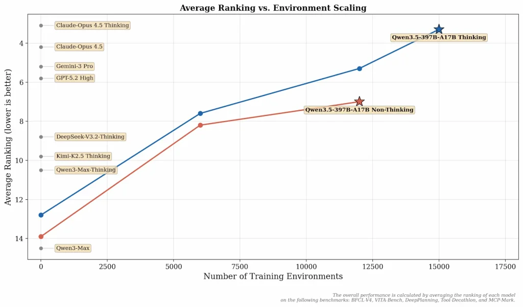 در ارزیابیهای BabyVision و V* نتایج با فعال بودن Code Interpreter گزارش شدهاند که بدون آن بهترتیب ۴۳.۳ و ۹۱.۱ ثبت میشود. توسعهدهندگان اعلام کردهاند بهبودهای Qwen3.5 نسبت به سری Qwen3 حاصل مقیاسدهی گسترده محیطهای RL با تمرکز بر افزایش دشواری و تعمیمپذیری بوده است. عملکرد کلی با میانگین رتبه در BFCL-V4، VITA-Bench، DeepPlanning، Tool-Decathlon و MCP-Mark محاسبه شده است.